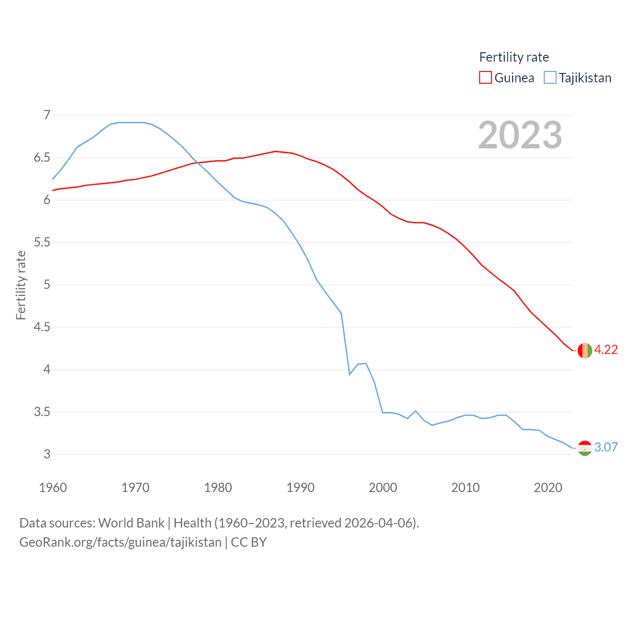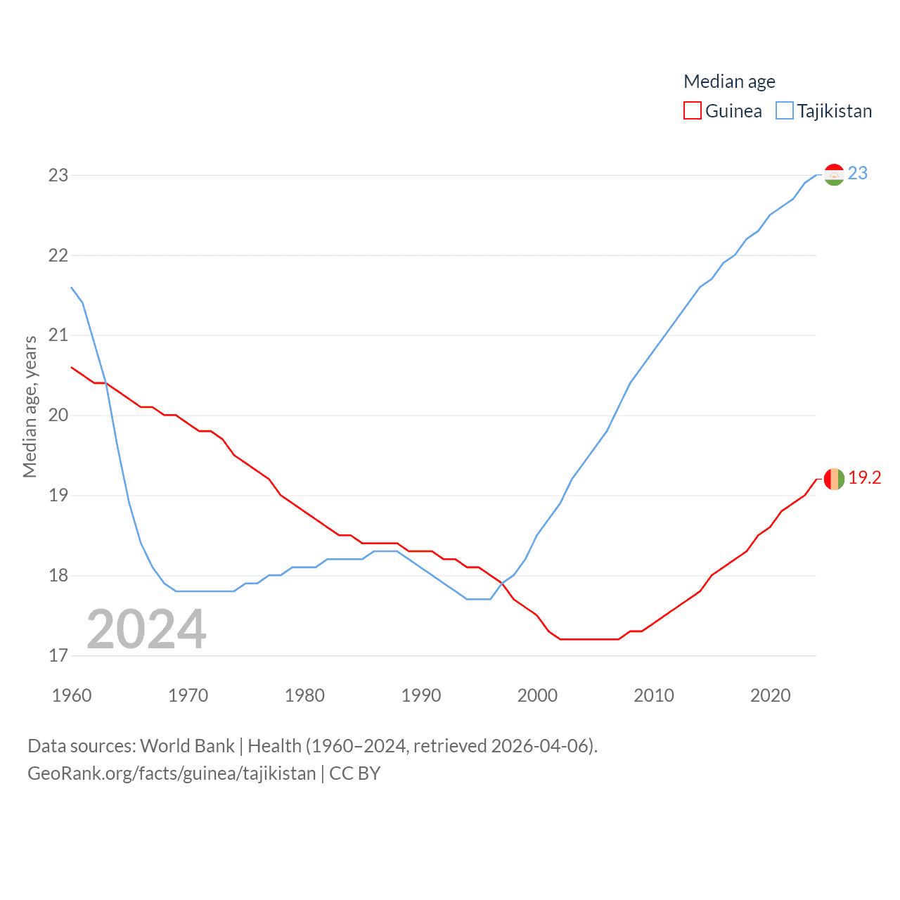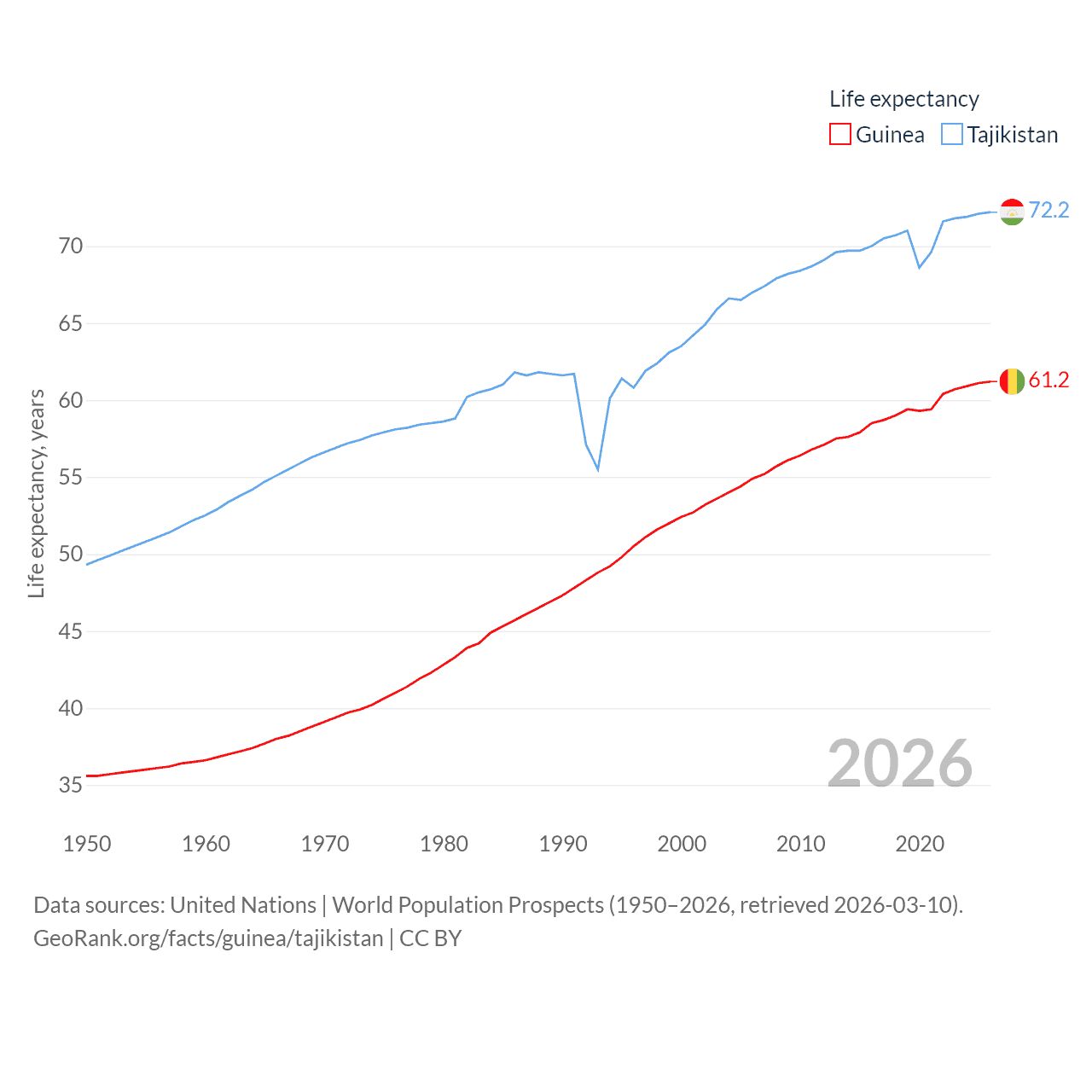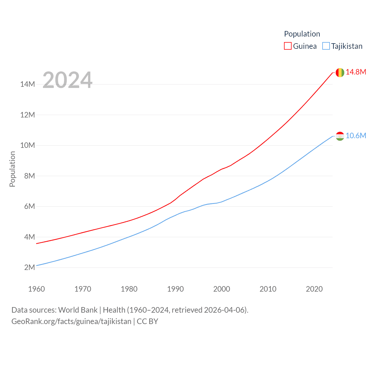 Guinea has a population of 14.8M (ranked 75/197), compared with 10.6M in Tajikistan (ranked 91/197). Guinea's land area is 94,873 sq mi versus 53,587 sq mi for Tajikistan (ranked 77th vs. 93rd).