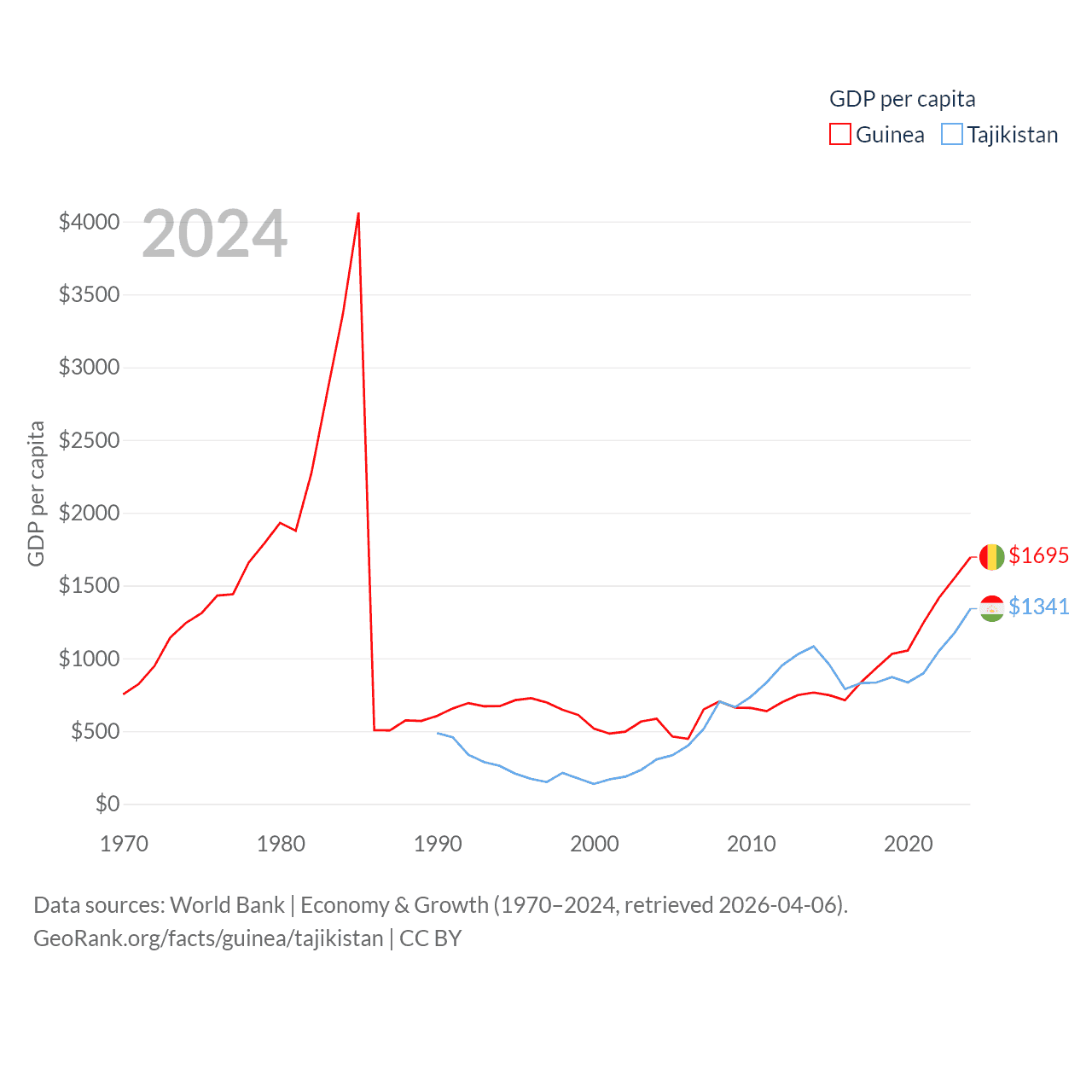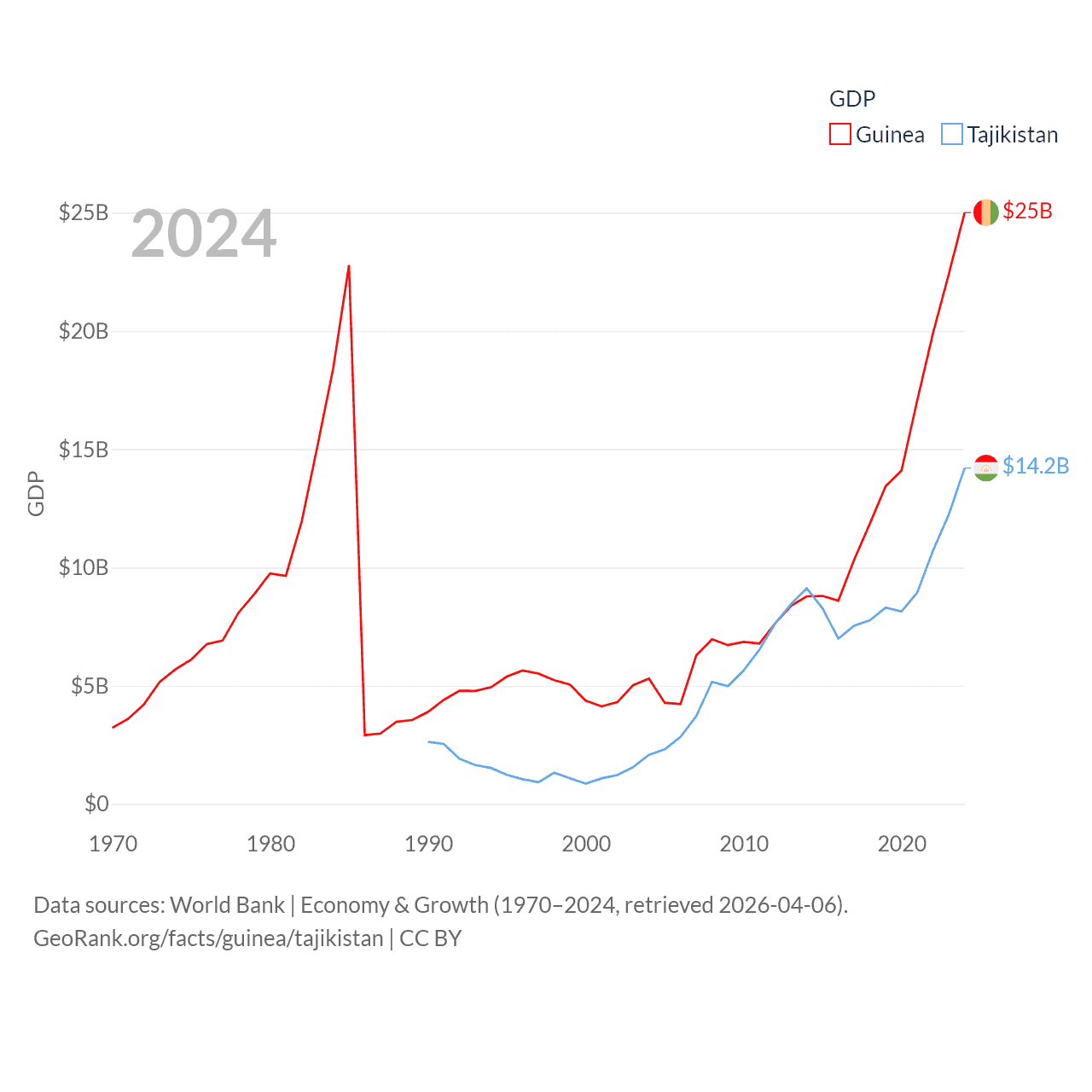 By GDP, Guinea ranks 118/197 ($25B) and Tajikistan ranks 145/197 ($14.2B). By GDP per capita, Guinea ranks 160/197 ($1,695), while Tajikistan ranks 166/197 ($1,341).