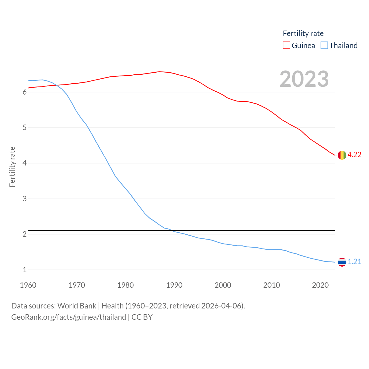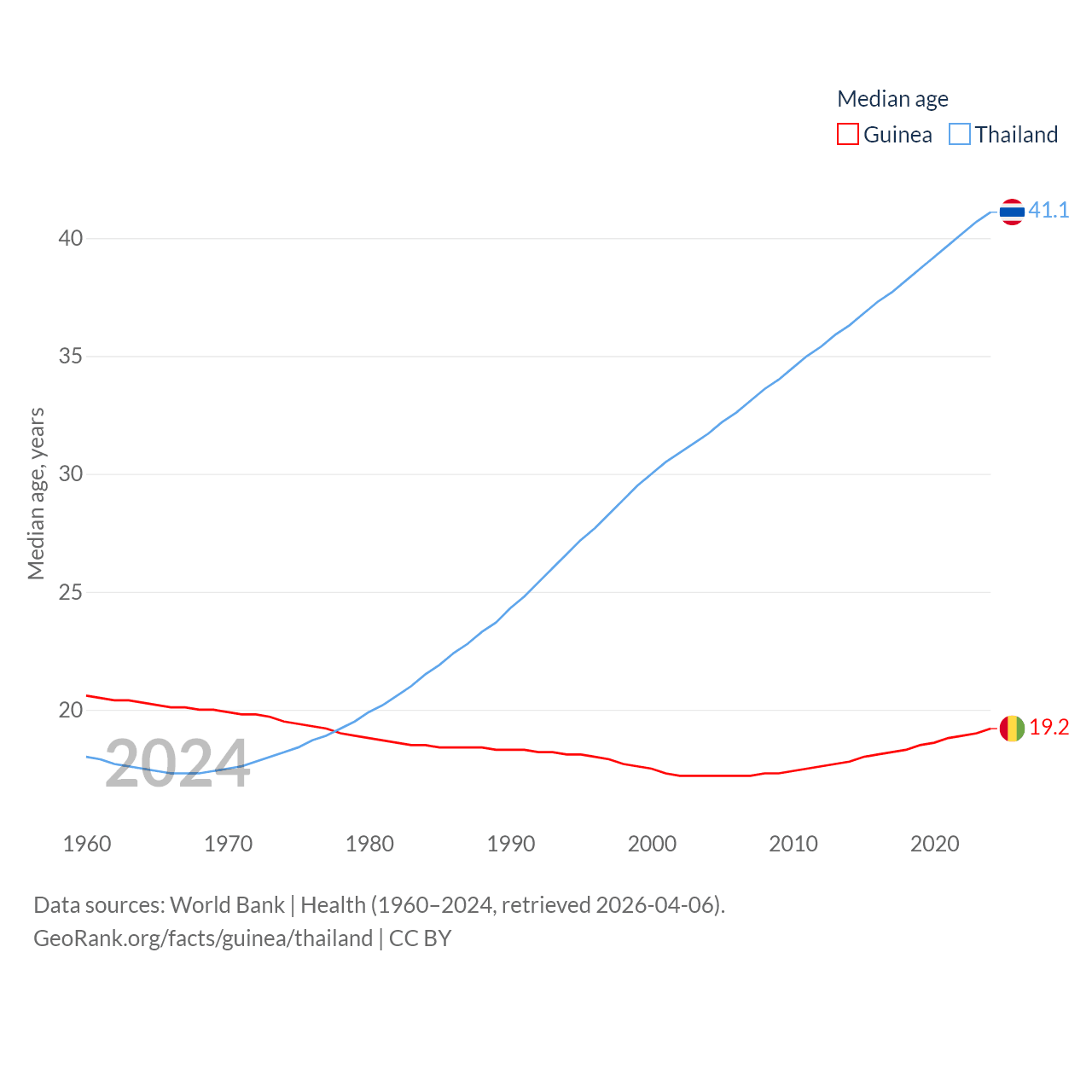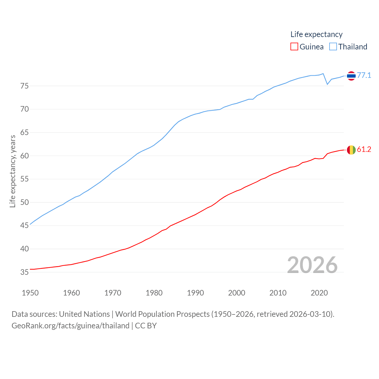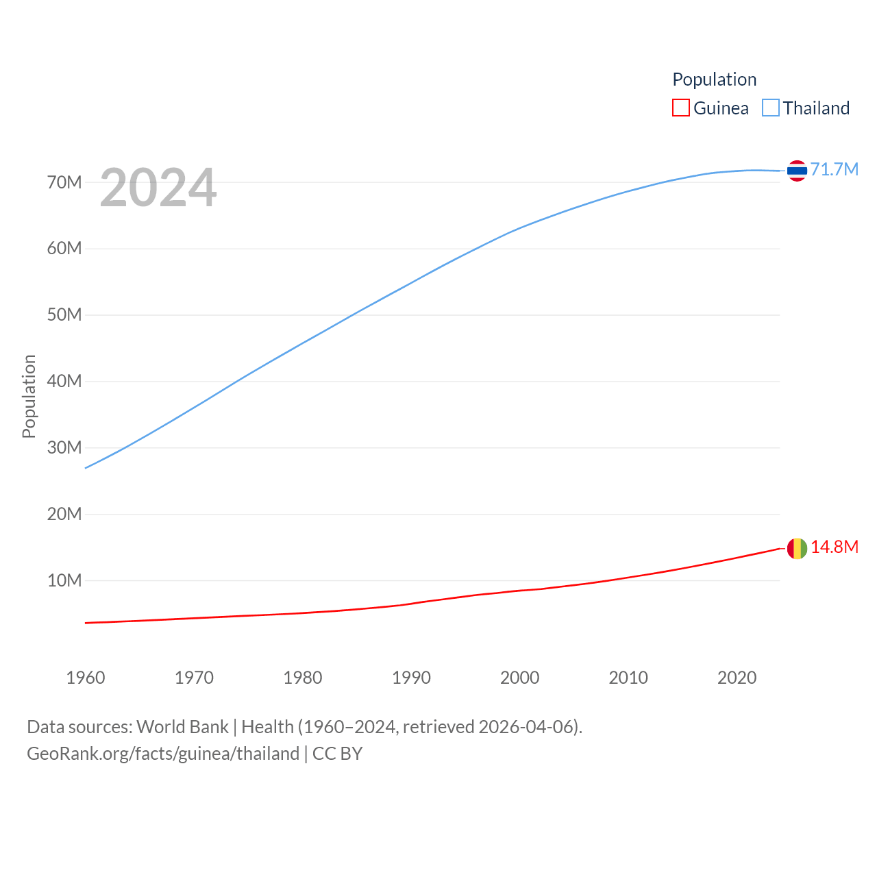 Guinea has a population of 14.8M (ranked 75/197), compared with 71.7M in Thailand (ranked 20/197). Guinea's land area is 94,873 sq mi versus 197,256 sq mi for Thailand (ranked 77th vs. 50th).