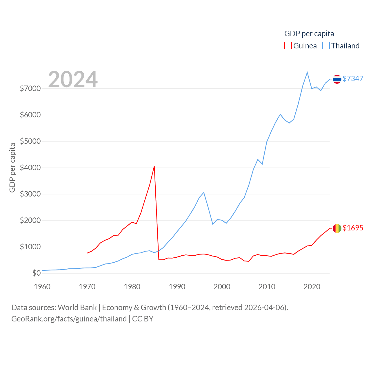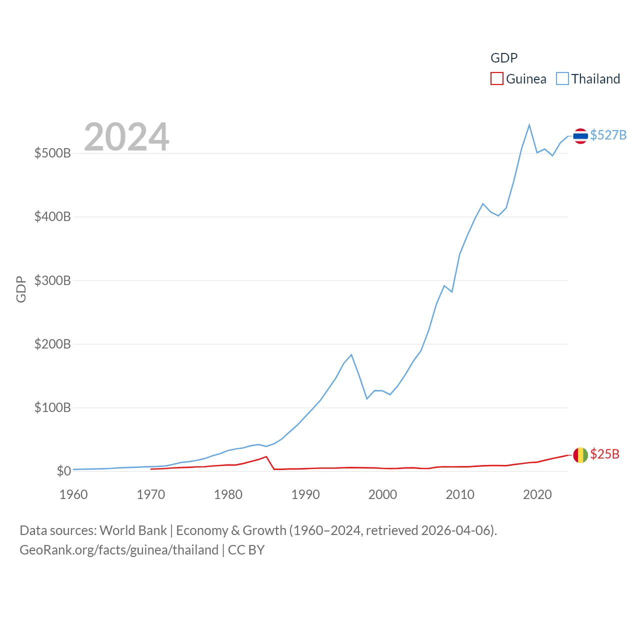 By GDP, Guinea ranks 118/197 ($25B) and Thailand ranks 31/197 ($527B). By GDP per capita, Guinea ranks 160/197 ($1,695), while Thailand ranks 100/197 ($7,347).