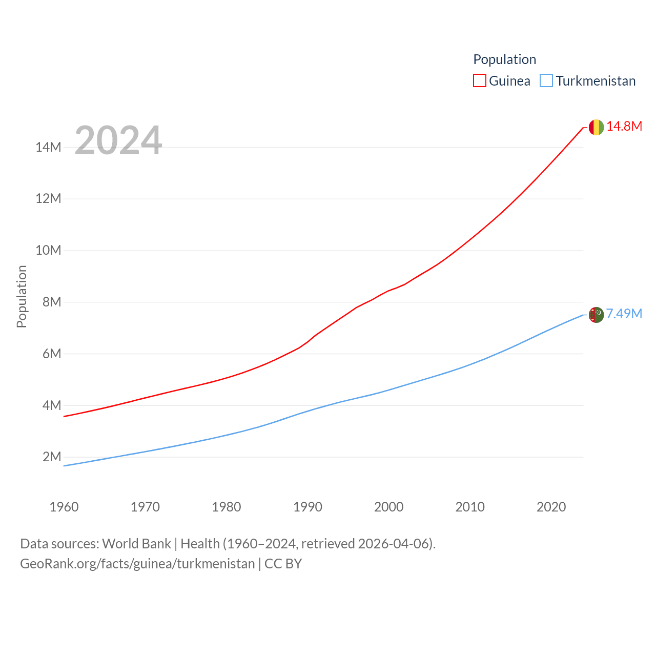 Guinea has a population of 14.8M (ranked 75/197), compared with 7.49M in Turkmenistan (ranked 104/197). Guinea's land area is 94,873 sq mi versus 181,441 sq mi for Turkmenistan (ranked 77th vs. 53rd).