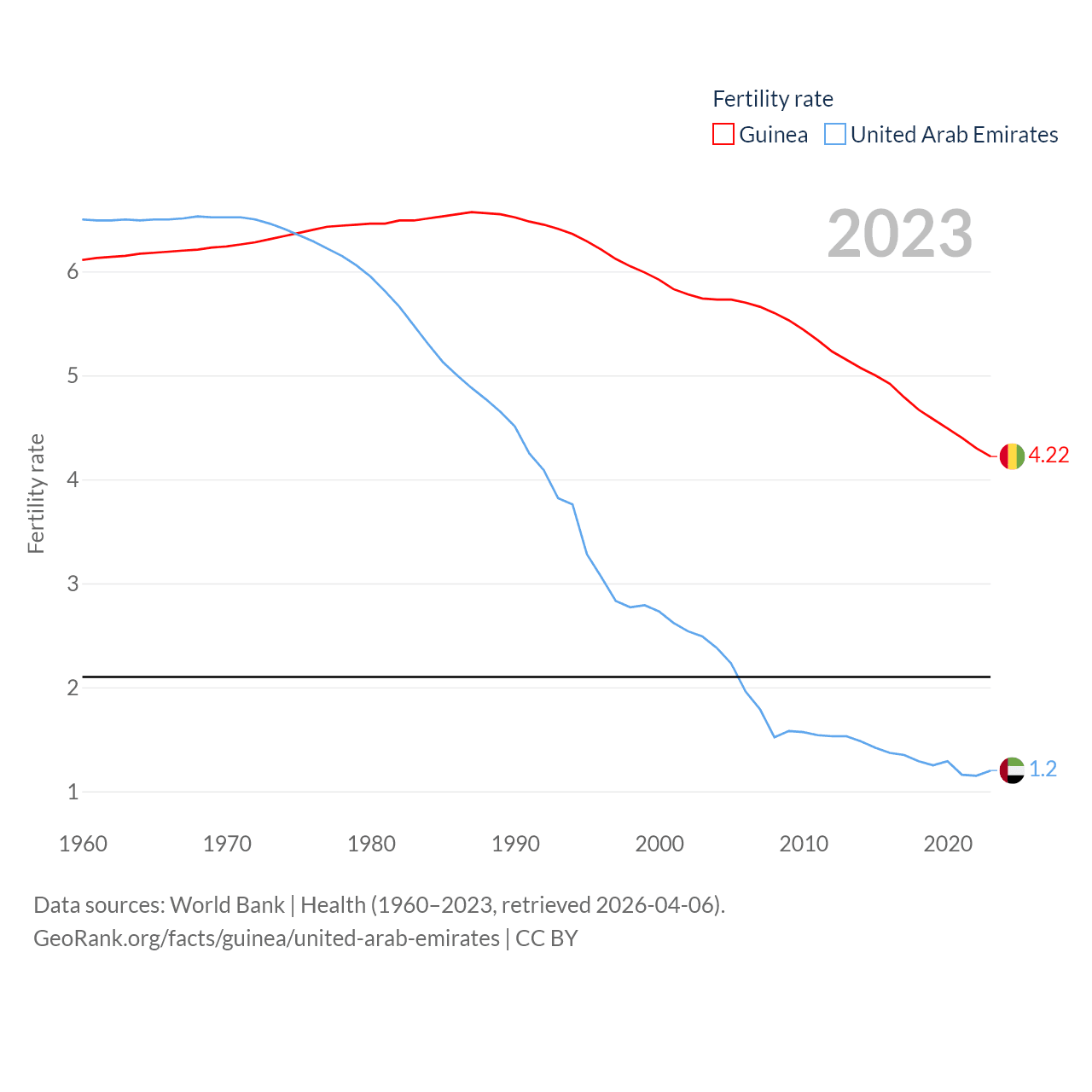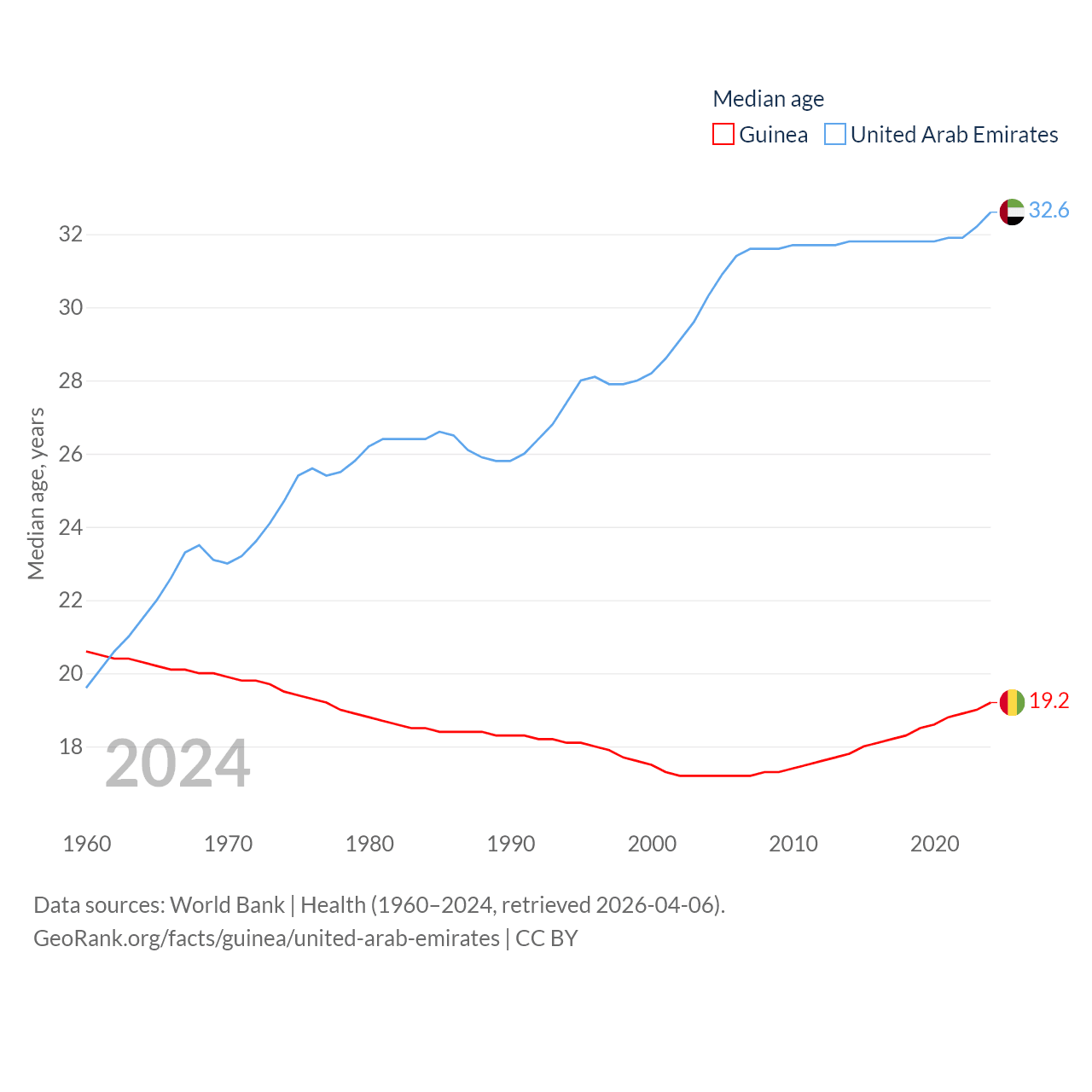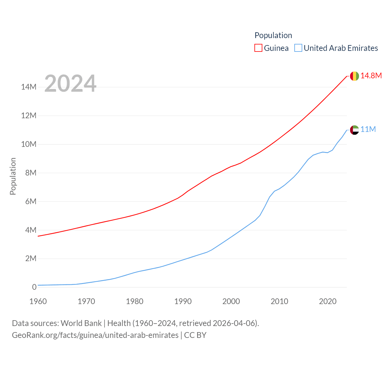 Guinea has a population of 14.8M (ranked 75/197), compared with 11M in The United Arab Emirates (ranked 86/197). Guinea's land area is 94,873 sq mi versus 27,421 sq mi for The United Arab Emirates (ranked 77th vs. 117th).