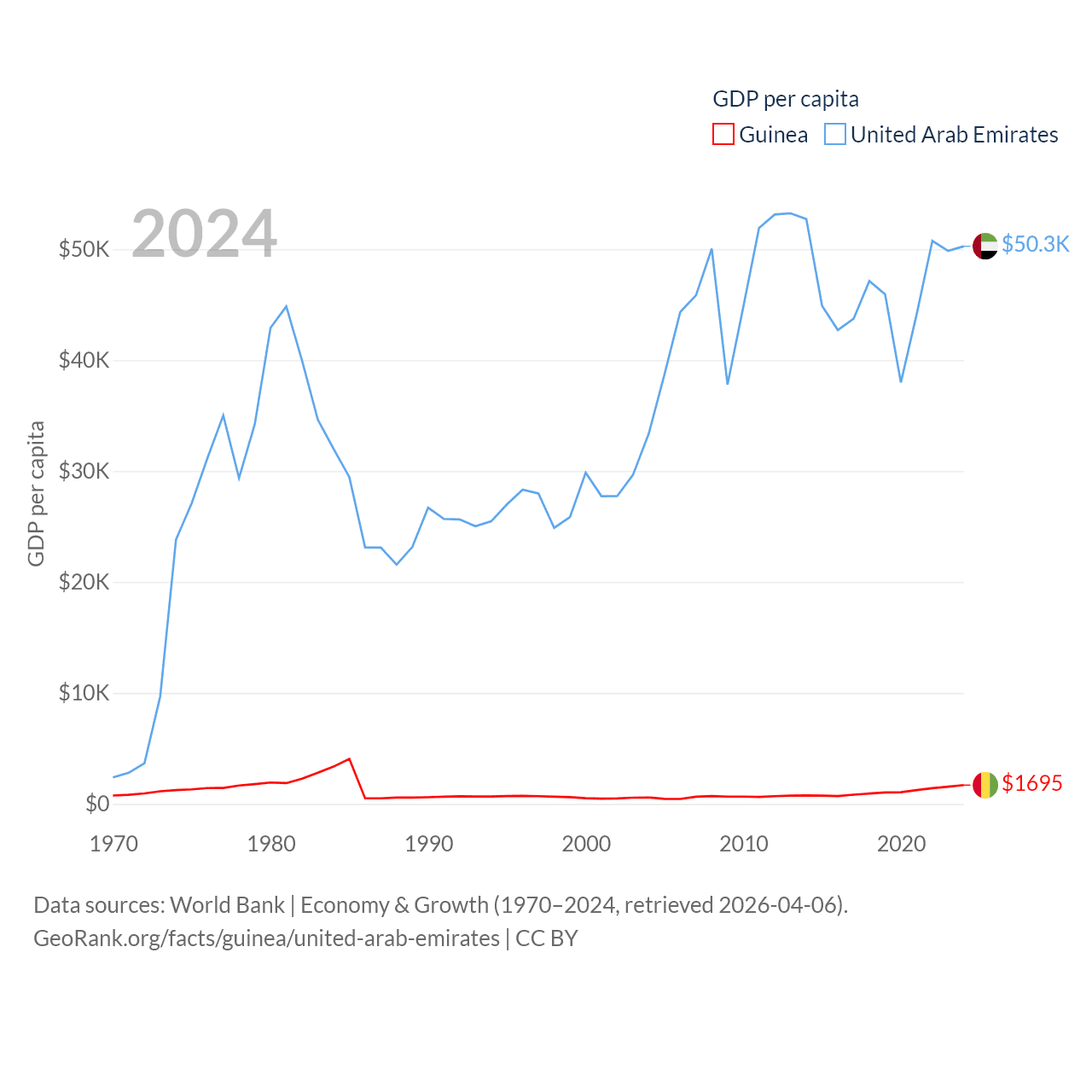 By GDP, Guinea ranks 118/197 ($25B) and The United Arab Emirates ranks 27/197 ($552B). By GDP per capita, Guinea ranks 160/197 ($1,695), while The United Arab Emirates ranks 24/197 ($50,274).
