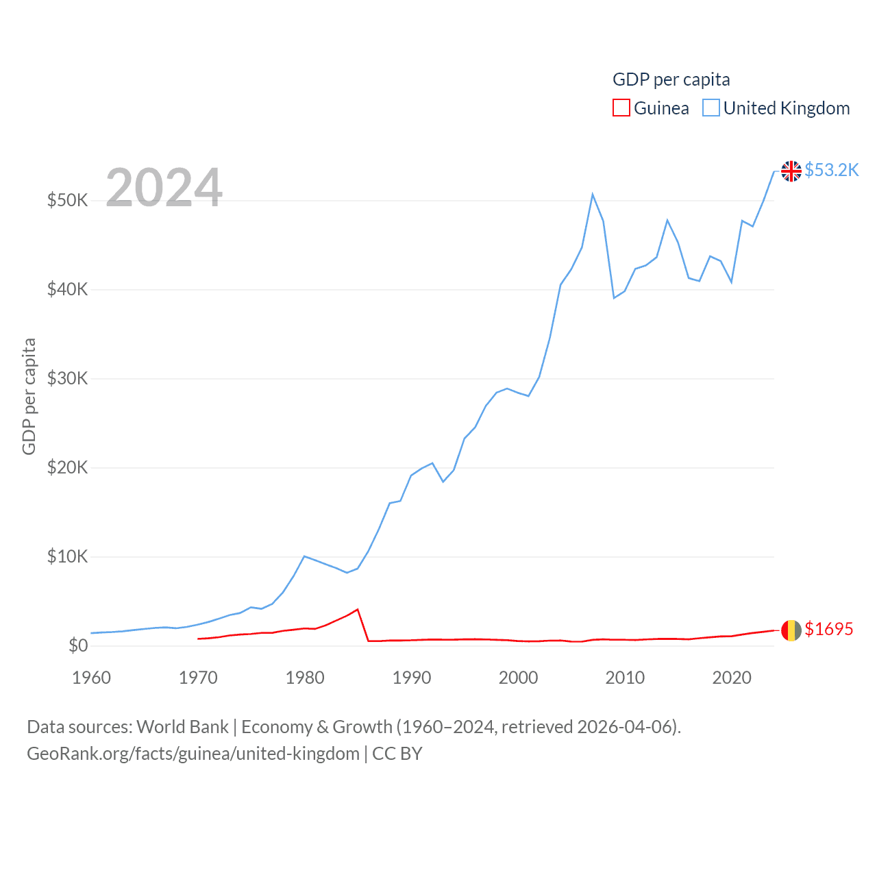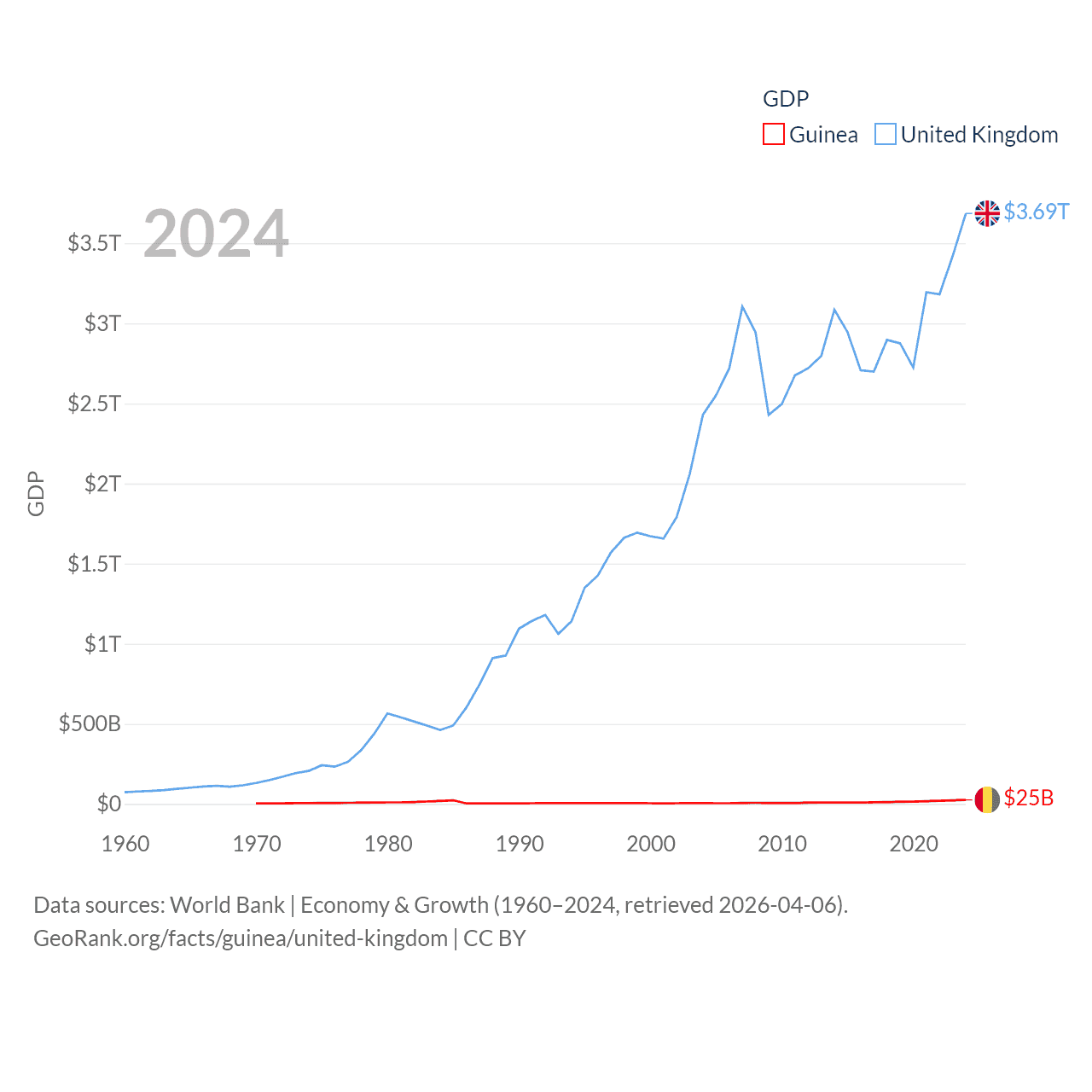 By GDP, Guinea ranks 118/197 ($25B) and The United Kingdom ranks 6/197 ($3.69T). By GDP per capita, Guinea ranks 160/197 ($1,695), while The United Kingdom ranks 22/197 ($53,246).