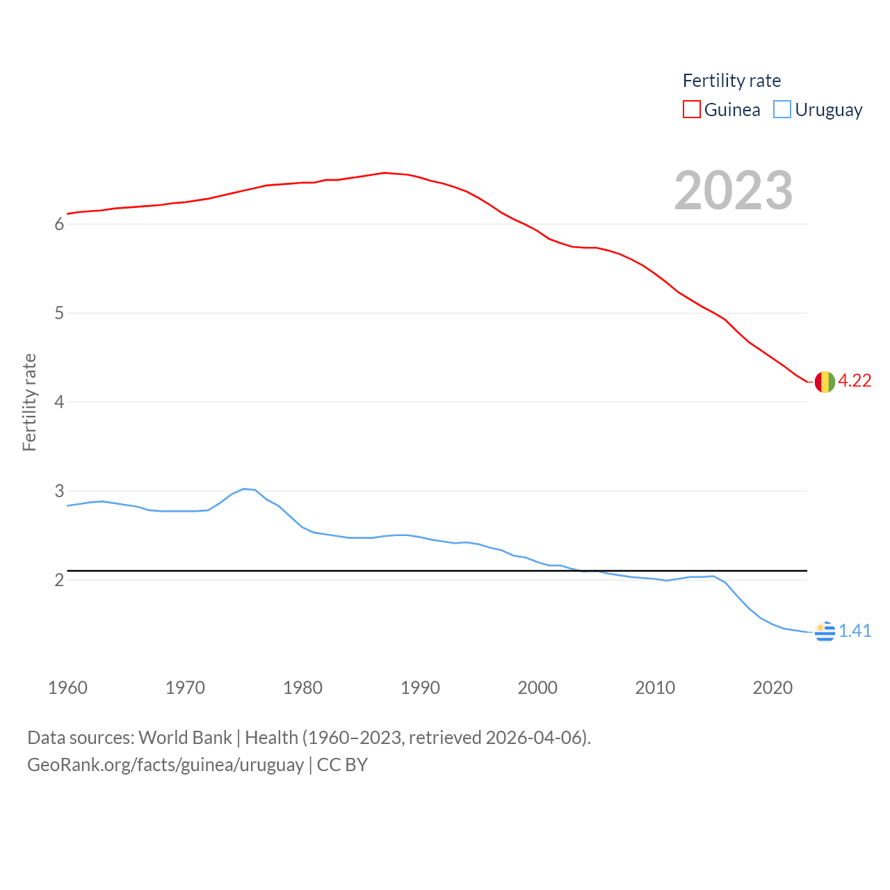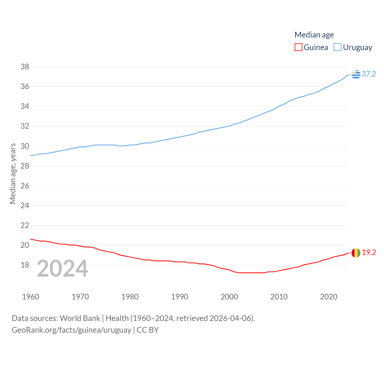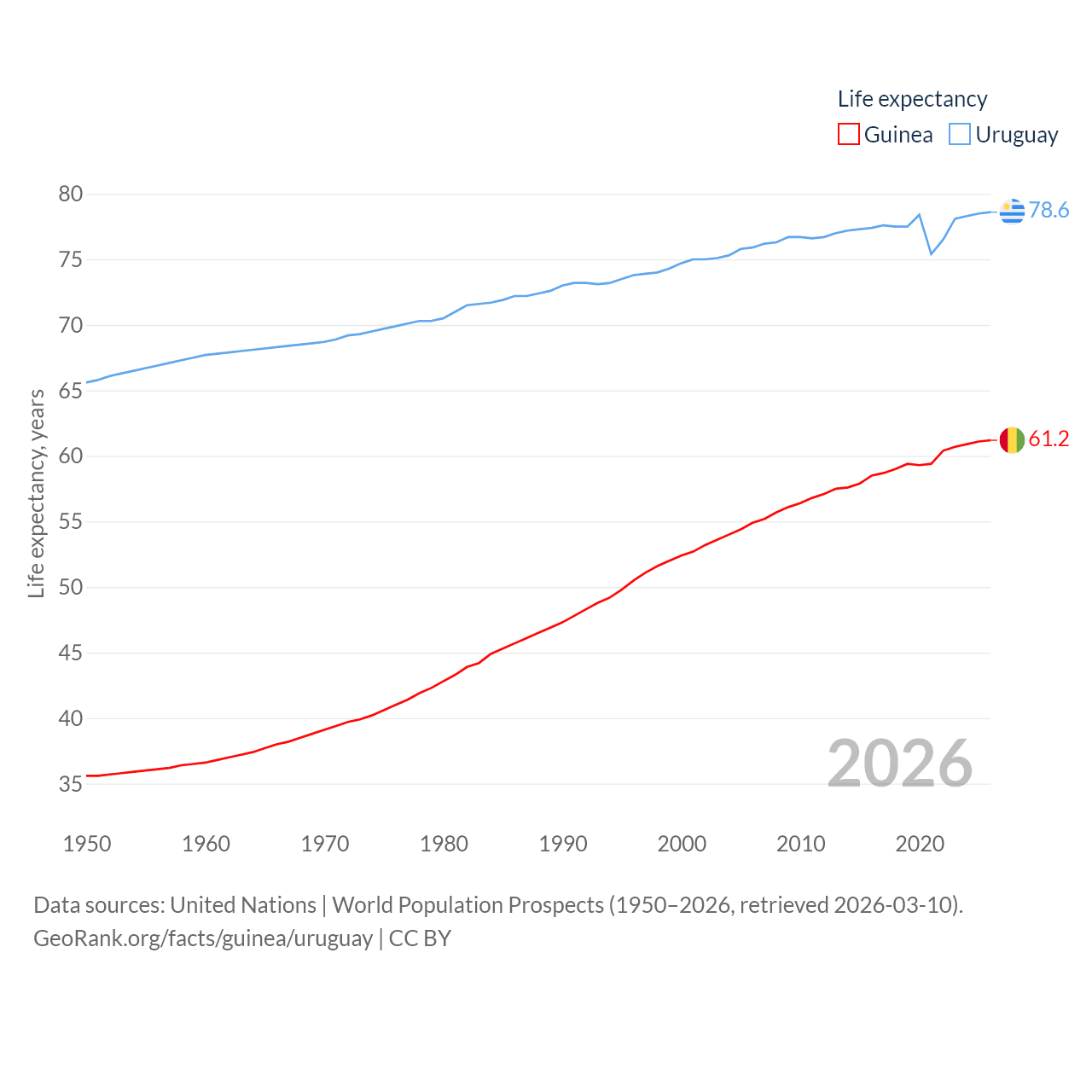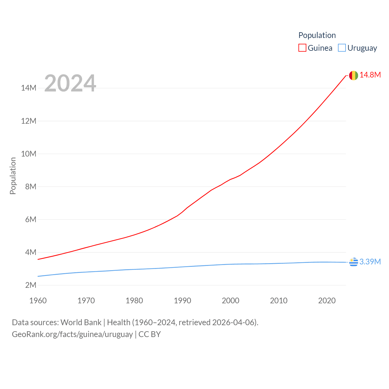 Guinea has a population of 14.8M (ranked 75/197), compared with 3.39M in Uruguay (ranked 133/197). Guinea's land area is 94,873 sq mi versus 67,576 sq mi for Uruguay (ranked 77th vs. 89th).