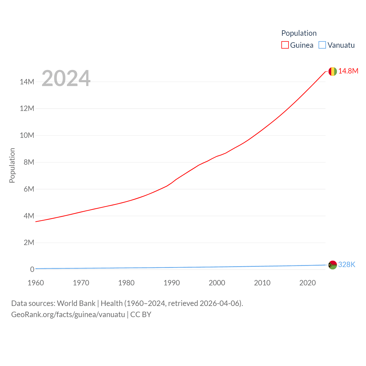 Guinea has a population of 14.8M (ranked 75/197), compared with 328K in Vanuatu (ranked 174/197). Guinea's land area is 94,873 sq mi versus 4,707 sq mi for Vanuatu (ranked 77th vs. 157th).