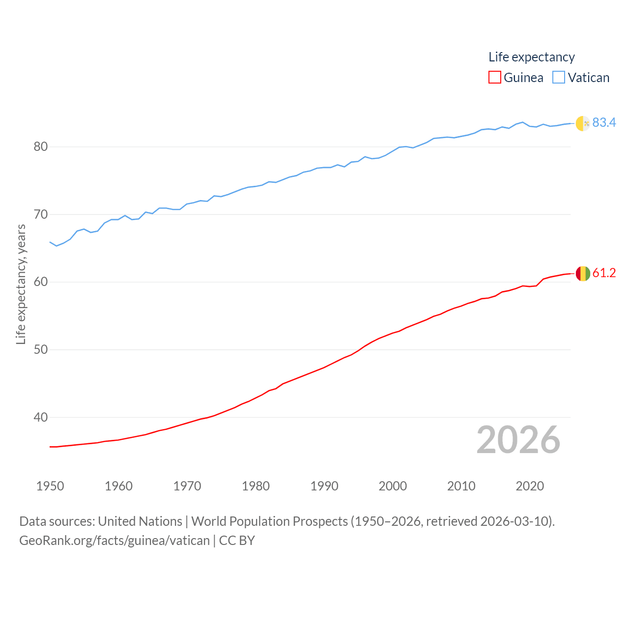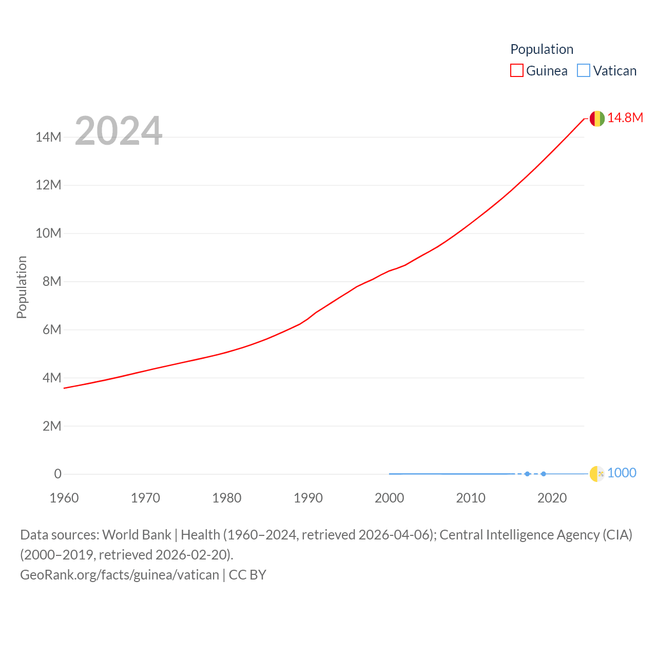 Guinea has a population of 14.8M (ranked 75/197), compared with 1K in The Vatican (ranked 197/197). Guinea's land area is 94,873 sq mi versus 0.17 sq mi for The Vatican (ranked 77th vs. 197th).