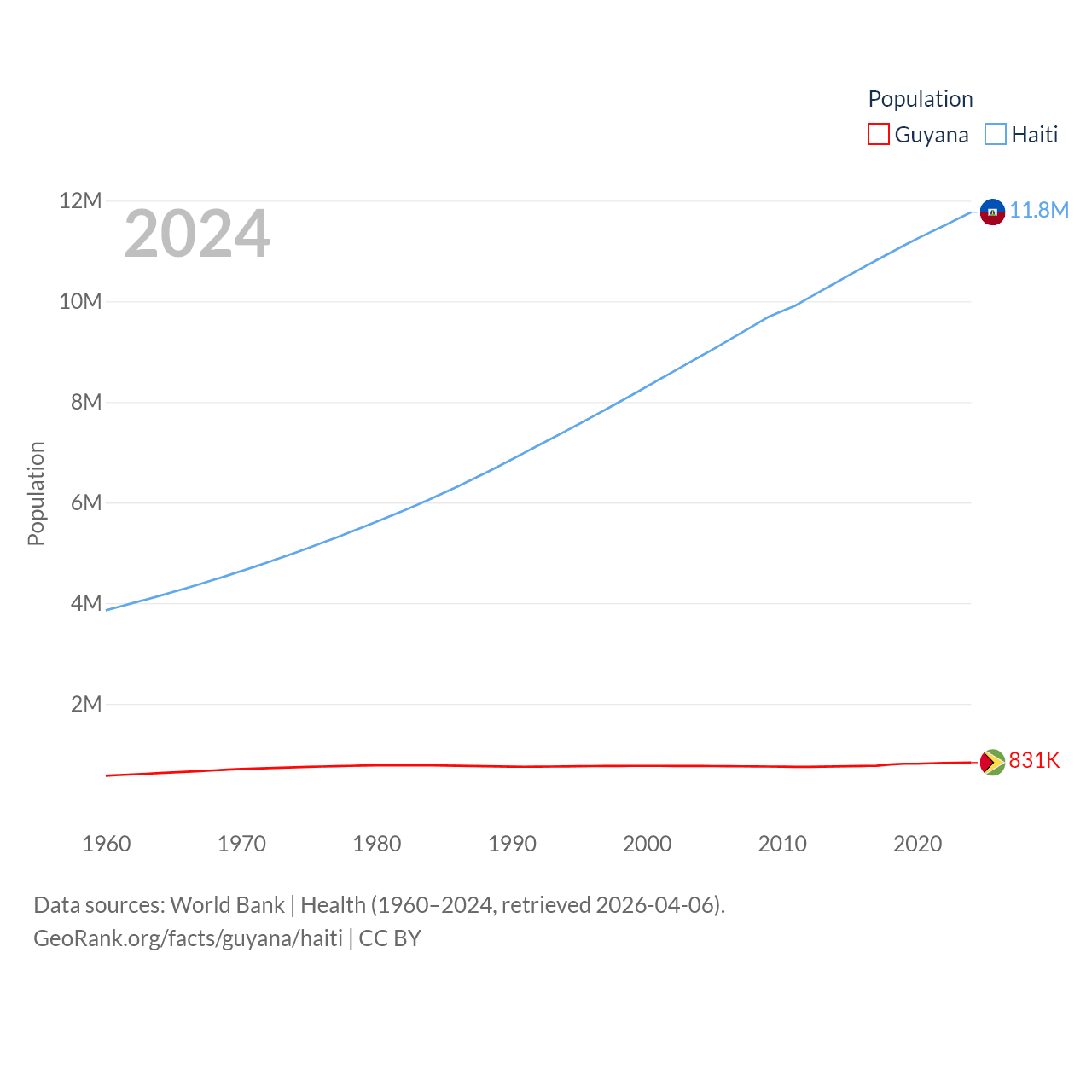 Guyana has a population of 831K (ranked 161/197), compared with 11.8M in Haiti (ranked 83/197). Guyana's land area is 81,522 sq mi versus 10,641 sq mi for Haiti (ranked 82nd vs. 142nd).