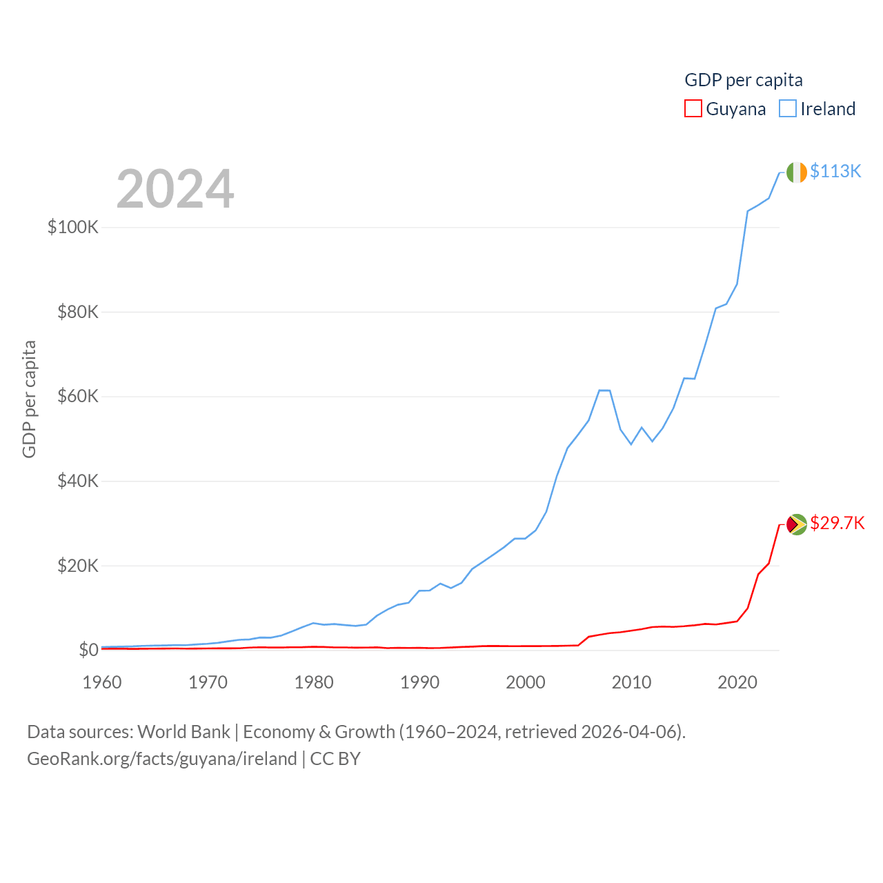By GDP, Guyana ranks 120/197 ($24.7B) and Ireland ranks 25/197 ($609B). By GDP per capita, Guyana ranks 41/197 ($29,675), while Ireland ranks 4/197 ($112,895).