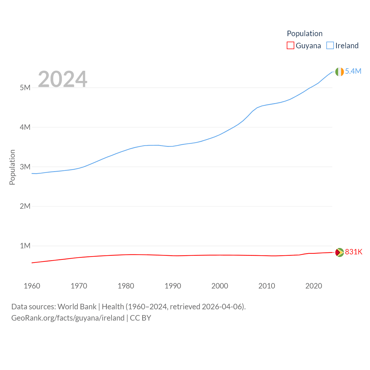 Guyana has a population of 831K (ranked 161/197), compared with 5.4M in Ireland (ranked 120/197). Guyana's land area is 81,522 sq mi versus 26,599 sq mi for Ireland (ranked 82nd vs. 119th).