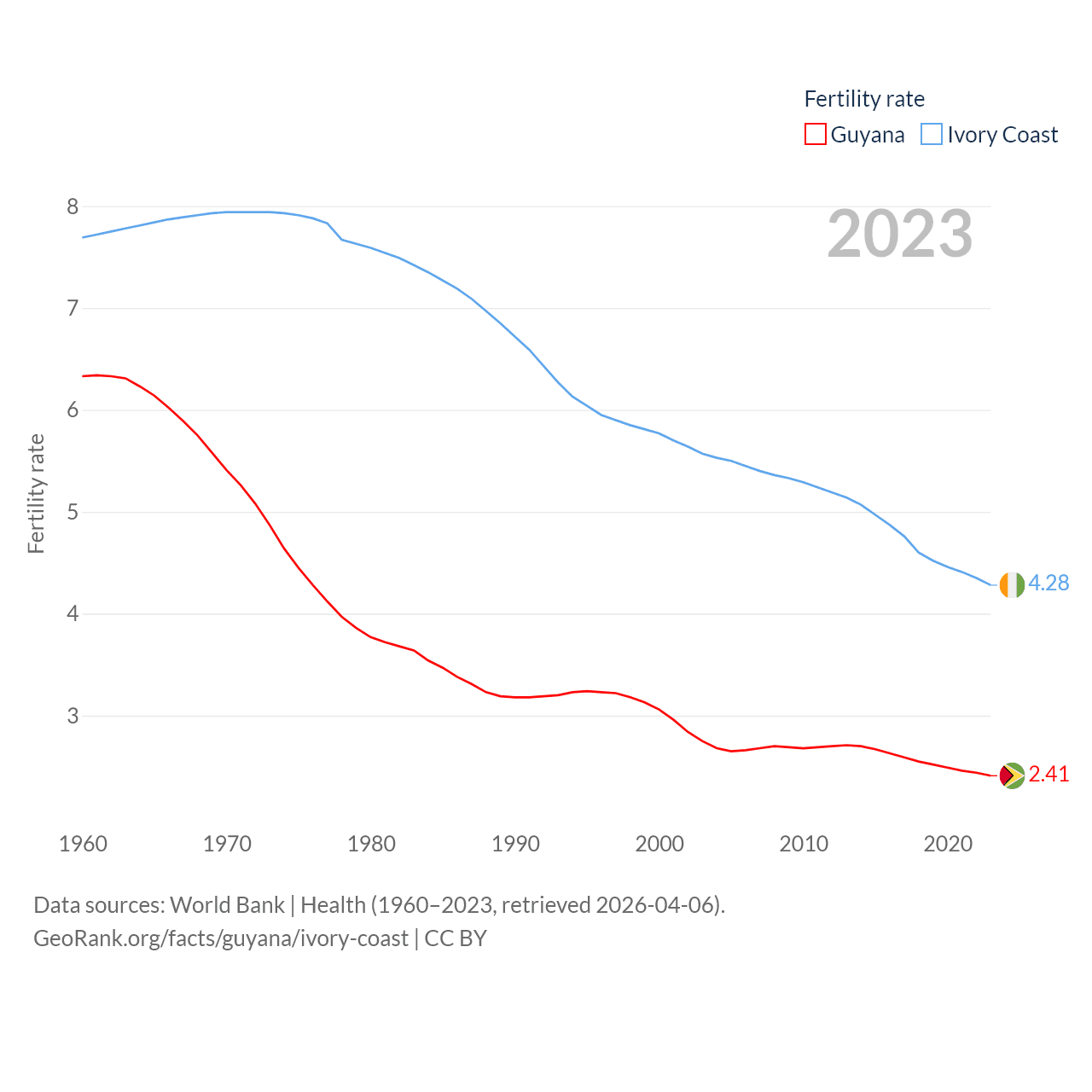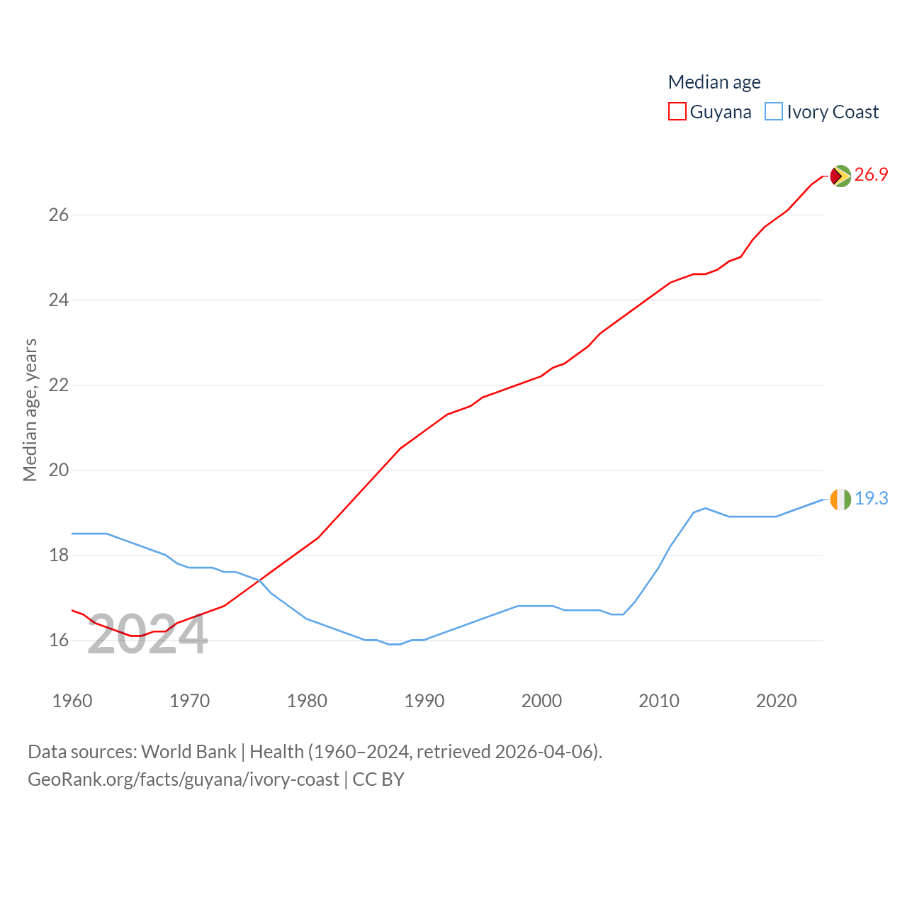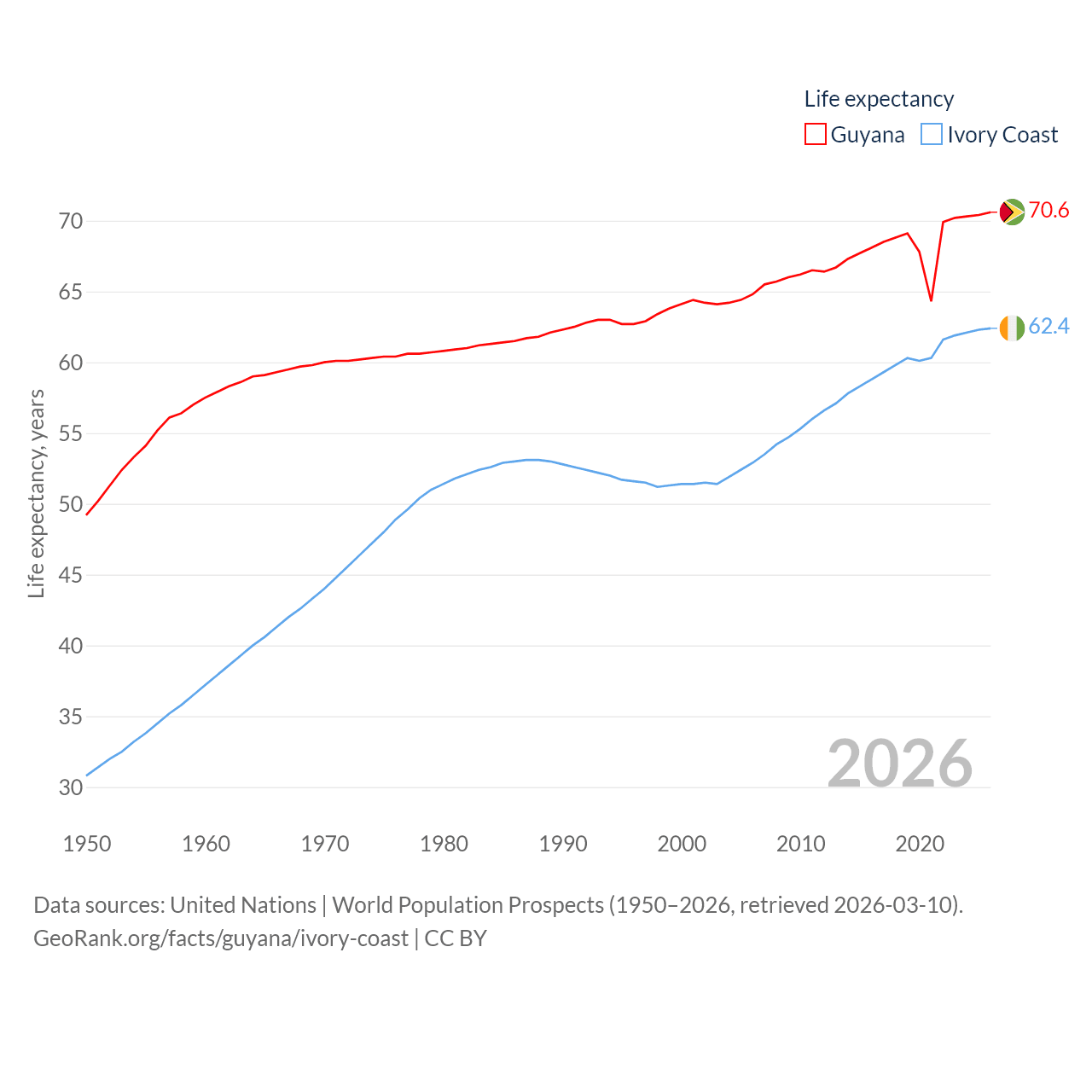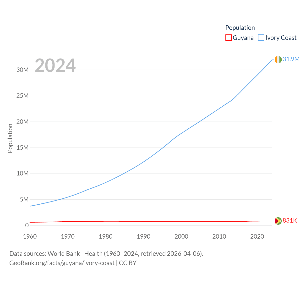 Guyana has a population of 831K (ranked 161/197), compared with 31.9M in Ivory Coast (ranked 50/197). Guyana's land area is 81,522 sq mi versus 122,780 sq mi for Ivory Coast (ranked 82nd vs. 66th).