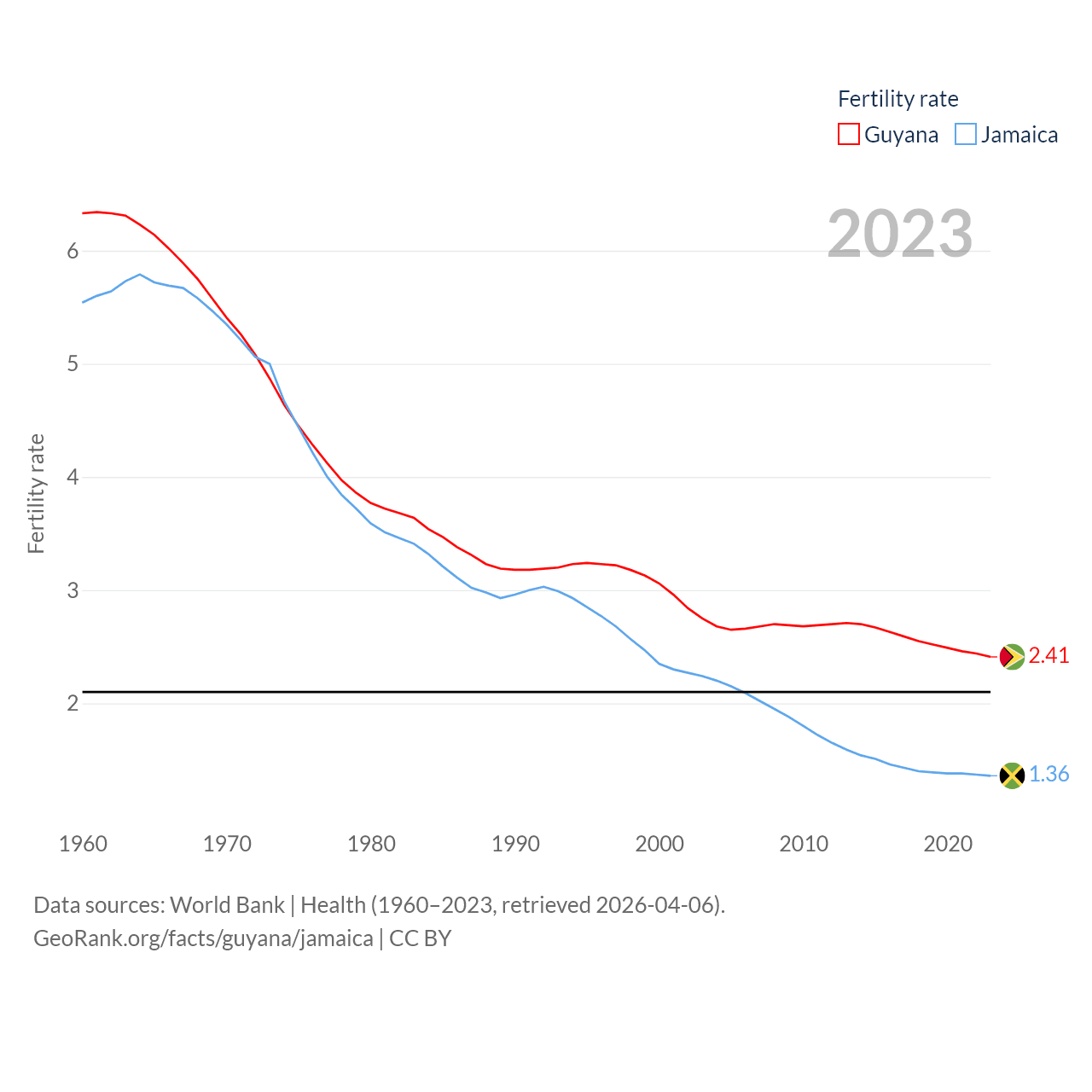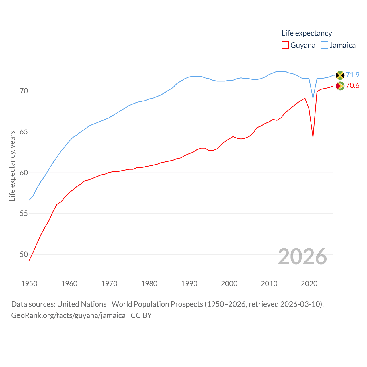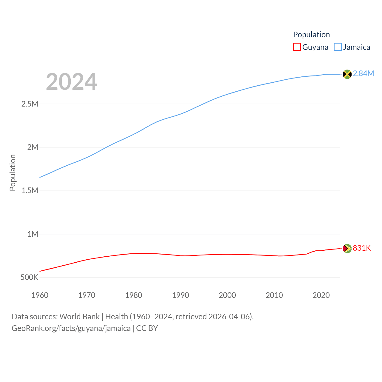 Guyana has a population of 831K (ranked 161/197), compared with 2.84M in Jamaica (ranked 139/197). Guyana's land area is 81,522 sq mi versus 4,181 sq mi for Jamaica (ranked 82nd vs. 159th).