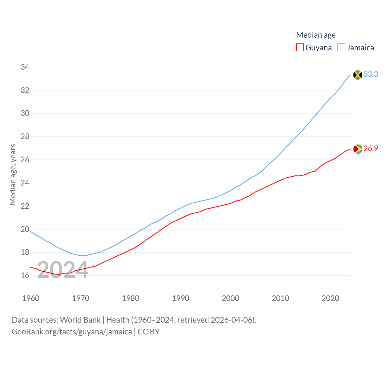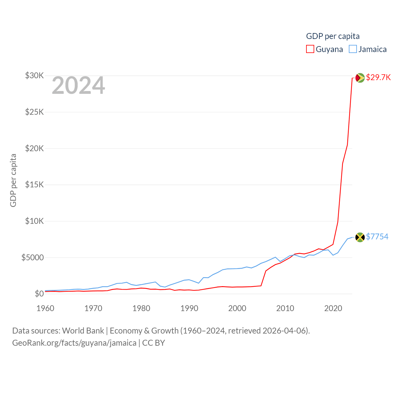 By GDP, Guyana ranks 120/197 ($24.7B) and Jamaica ranks 124/197 ($22B). By GDP per capita, Guyana ranks 41/197 ($29,675), while Jamaica ranks 95/197 ($7,754).