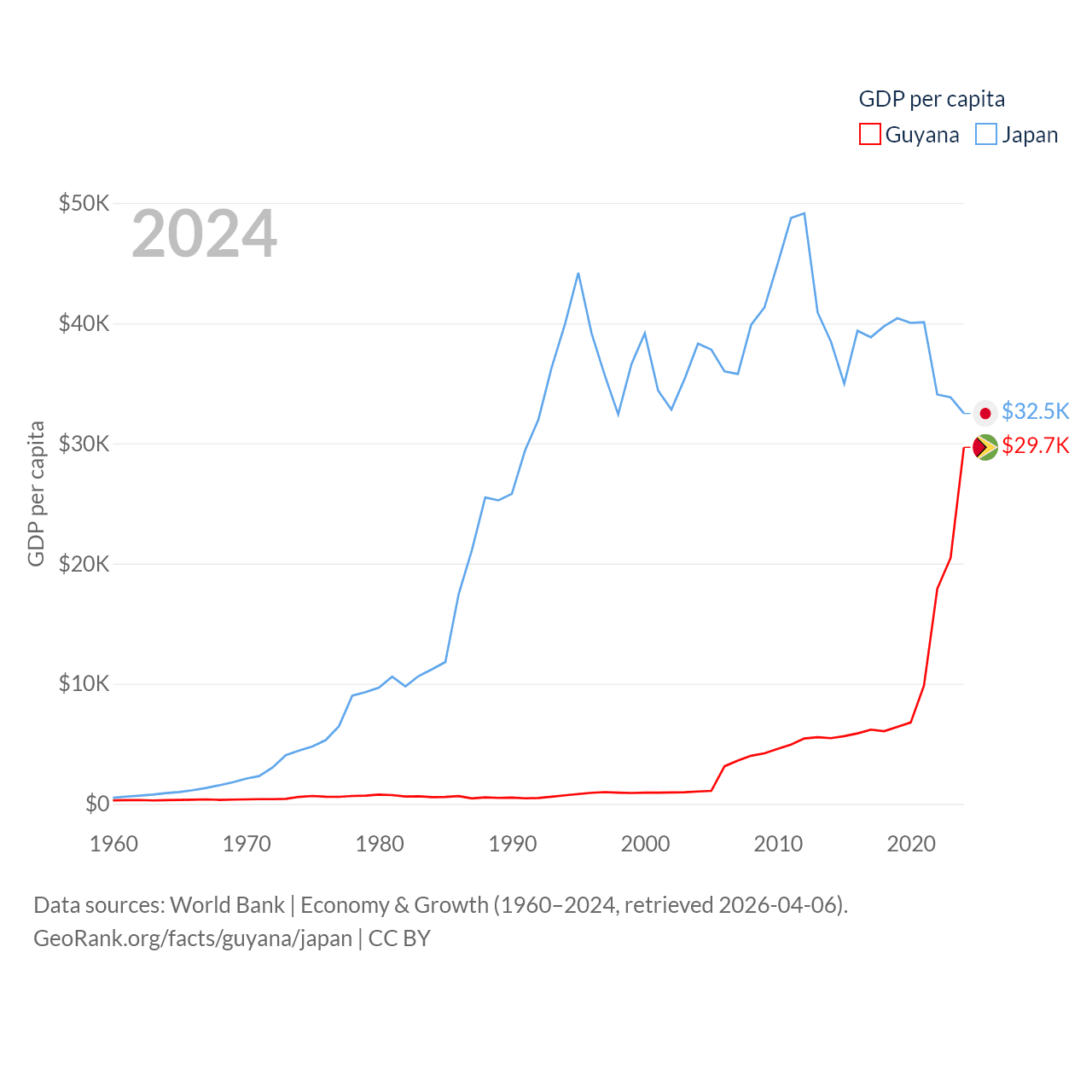 By GDP, Guyana ranks 120/197 ($24.7B) and Japan ranks 4/197 ($4.03T). By GDP per capita, Guyana ranks 41/197 ($29,675), while Japan ranks 38/197 ($32,487).