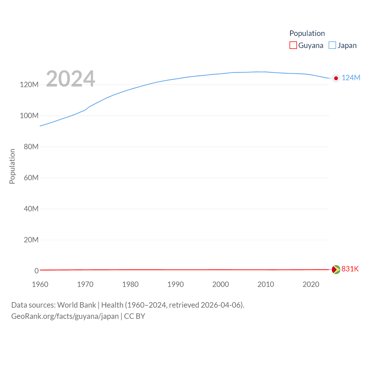 Guyana has a population of 831K (ranked 161/197), compared with 124M in Japan (ranked 12/197). Guyana's land area is 81,522 sq mi versus 140,761 sq mi for Japan (ranked 82nd vs. 61st).