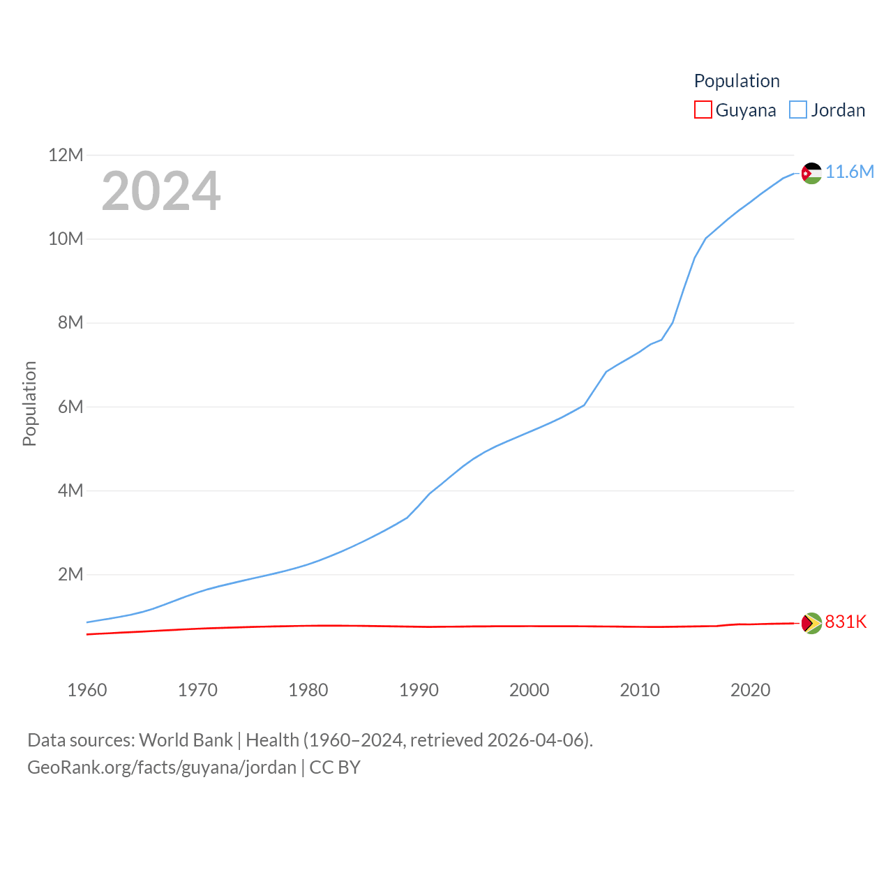 Guyana has a population of 831K (ranked 161/197), compared with 11.6M in Jordan (ranked 84/197). Guyana's land area is 81,522 sq mi versus 34,284 sq mi for Jordan (ranked 82nd vs. 110th).
