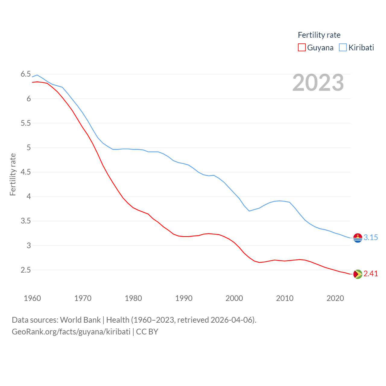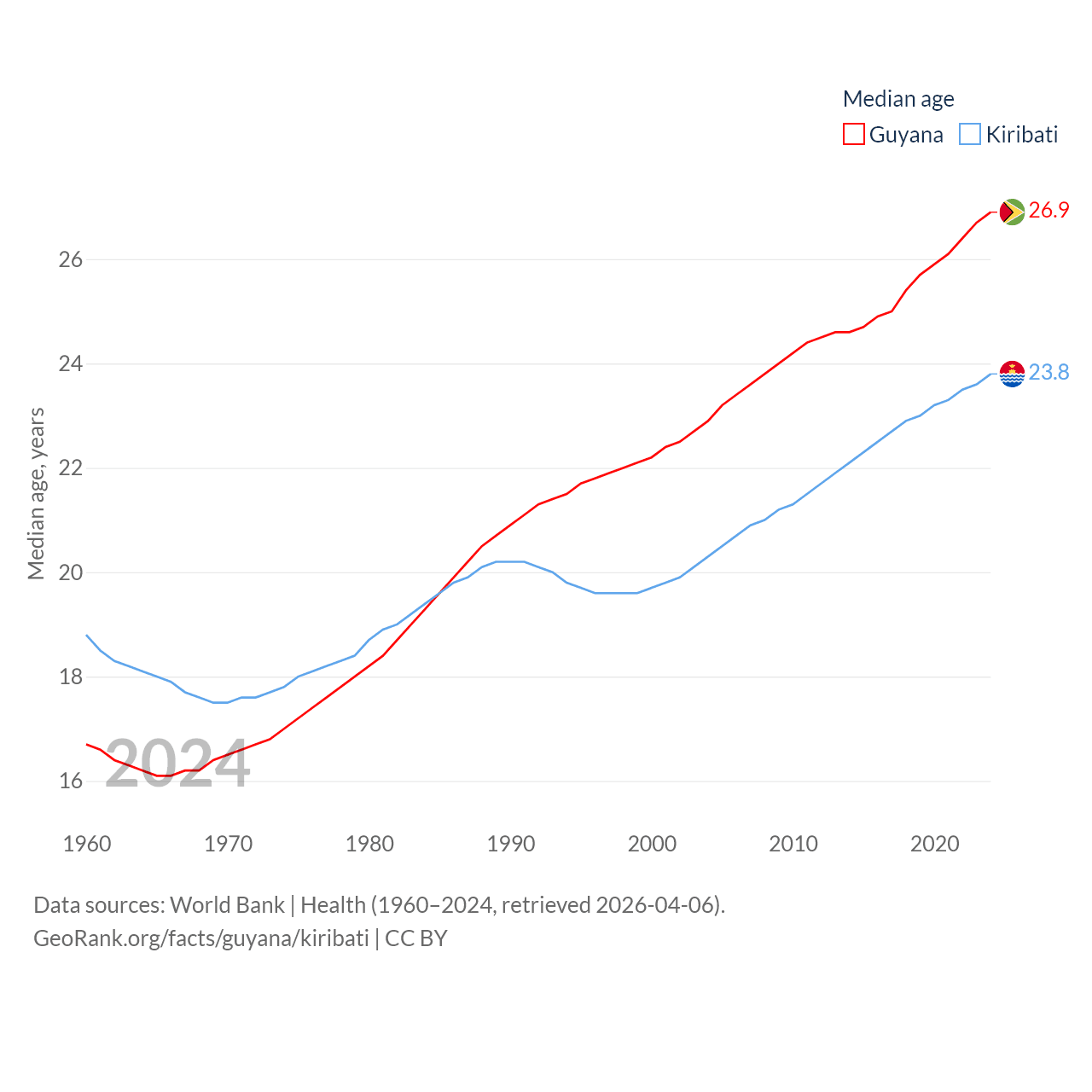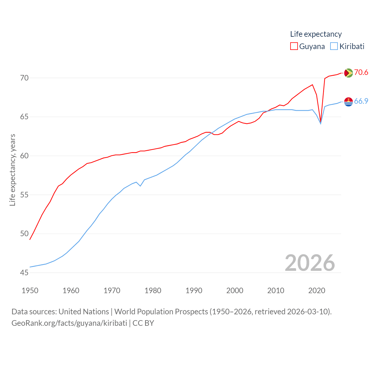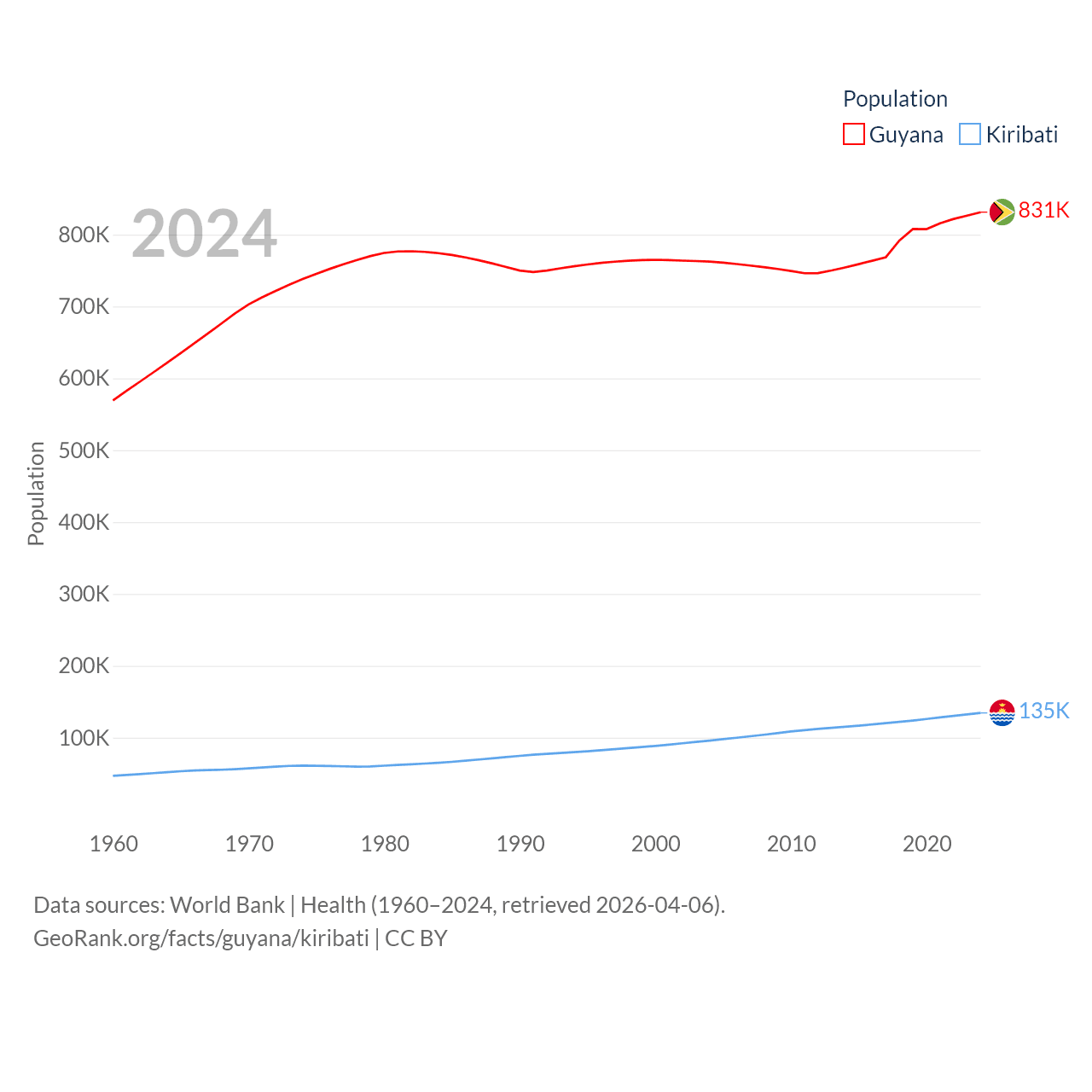 Guyana has a population of 831K (ranked 161/197), compared with 135K in Kiribati (ranked 180/197). Guyana's land area is 81,522 sq mi versus 313 sq mi for Kiribati (ranked 82nd vs. 173rd).