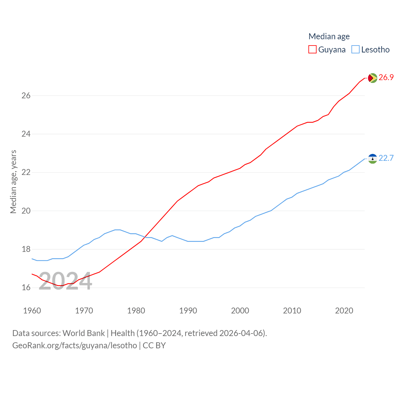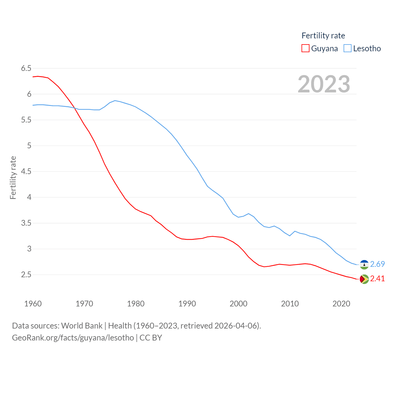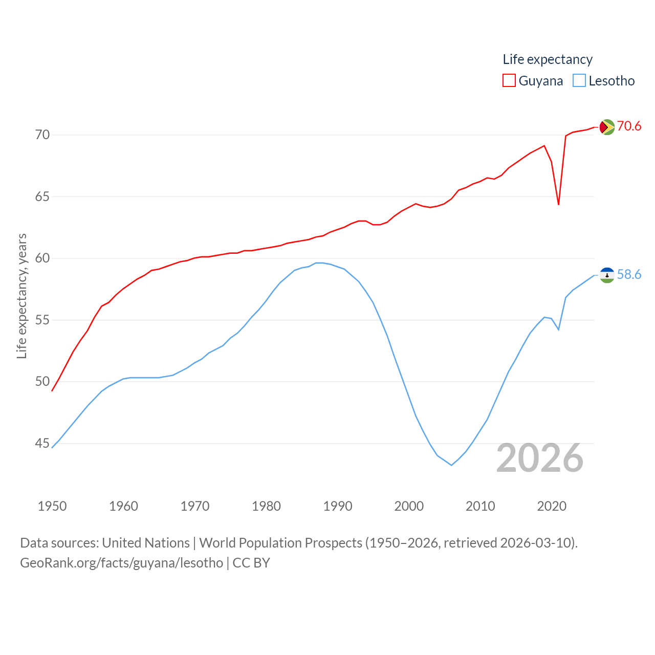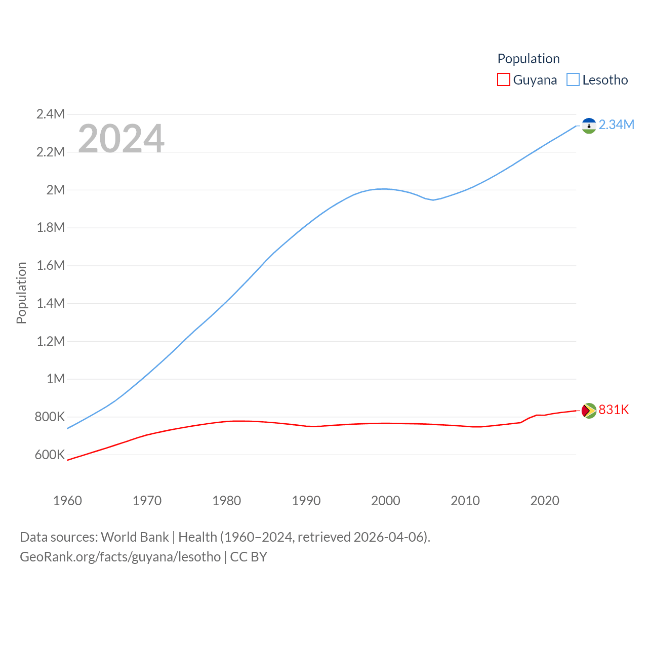 Guyana has a population of 831K (ranked 161/197), compared with 2.34M in Lesotho (ranked 145/197). Guyana's land area is 81,522 sq mi versus 11,722 sq mi for Lesotho (ranked 82nd vs. 137th).