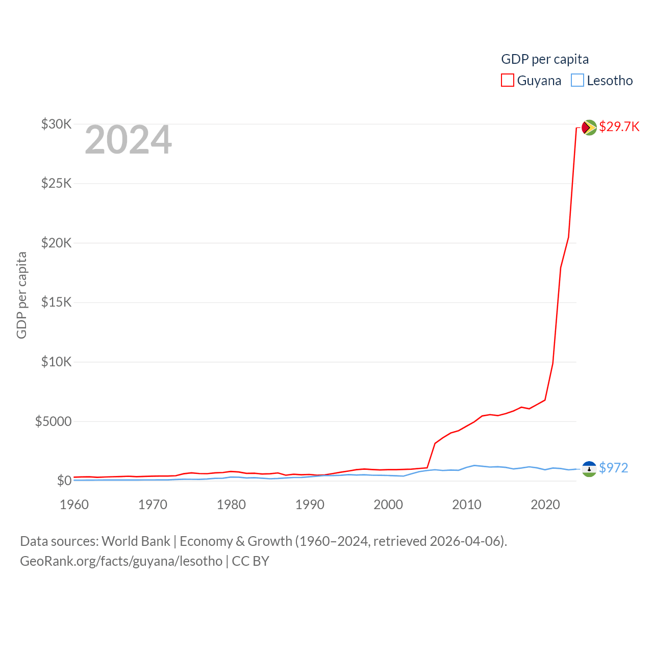 By GDP, Guyana ranks 120/197 ($24.7B) and Lesotho ranks 175/197 ($2.27B). By GDP per capita, Guyana ranks 41/197 ($29,675), while Lesotho ranks 181/197 ($972).