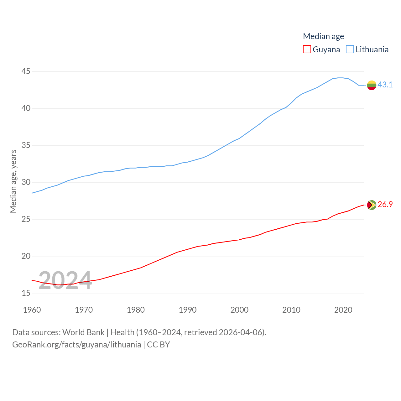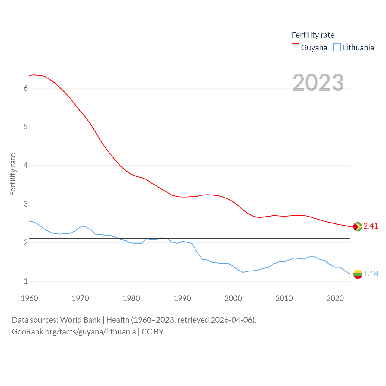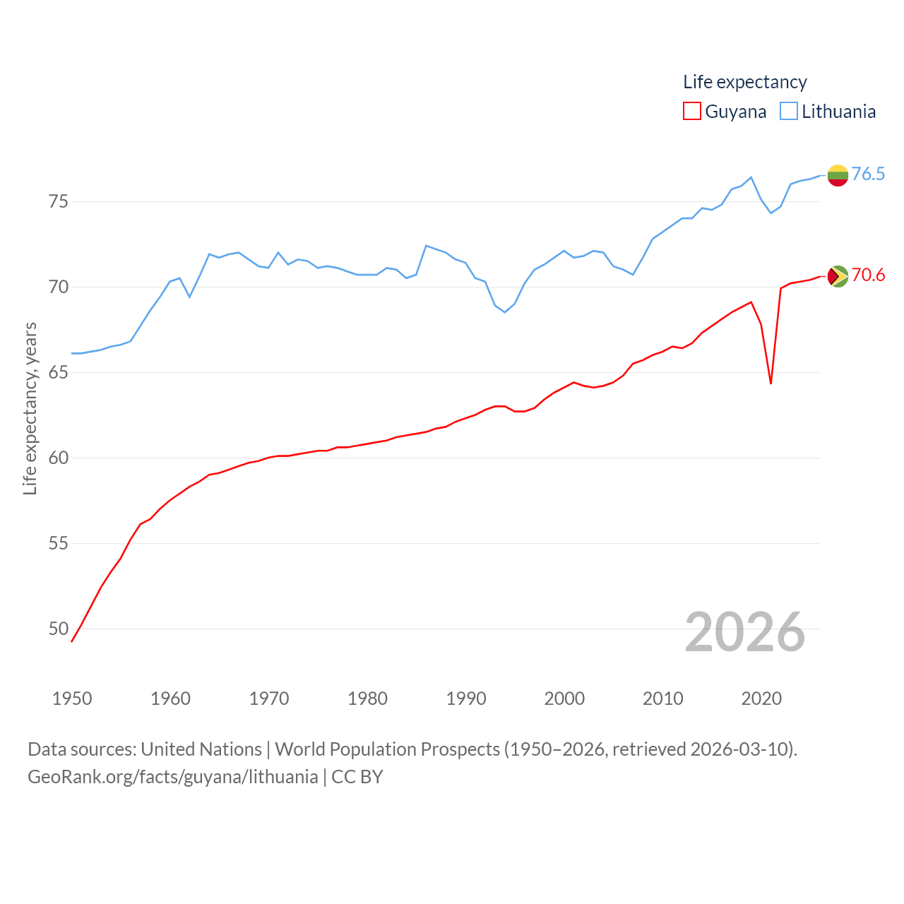 Guyana has a population of 831K (ranked 161/197), compared with 2.89M in Lithuania (ranked 137/197). Guyana's land area is 81,522 sq mi versus 24,170 sq mi for Lithuania (ranked 82nd vs. 120th).