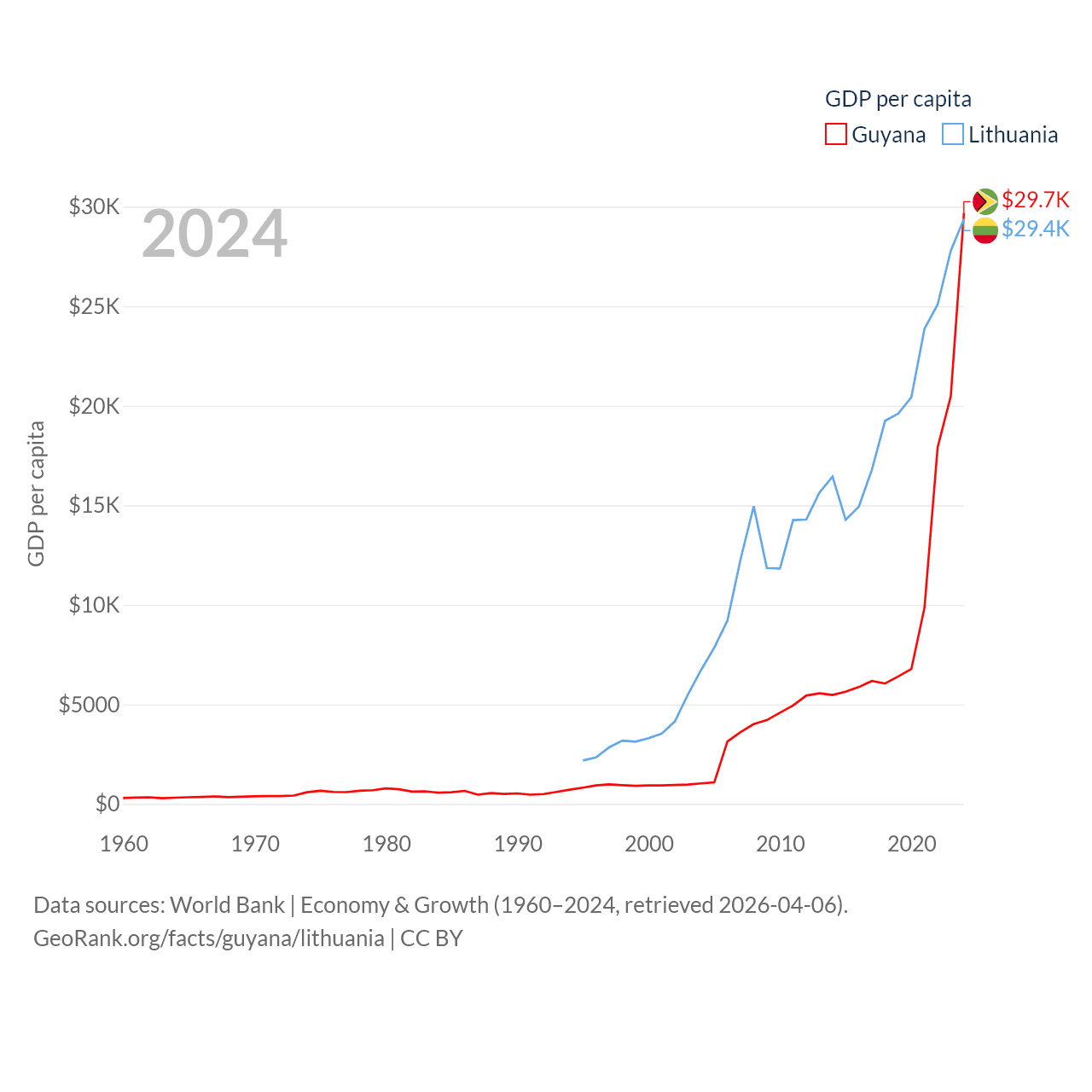 By GDP, Guyana ranks 120/197 ($24.7B) and Lithuania ranks 79/197 ($84.9B). By GDP per capita, Guyana ranks 41/197 ($29,675), while Lithuania ranks 43/197 ($29,384).