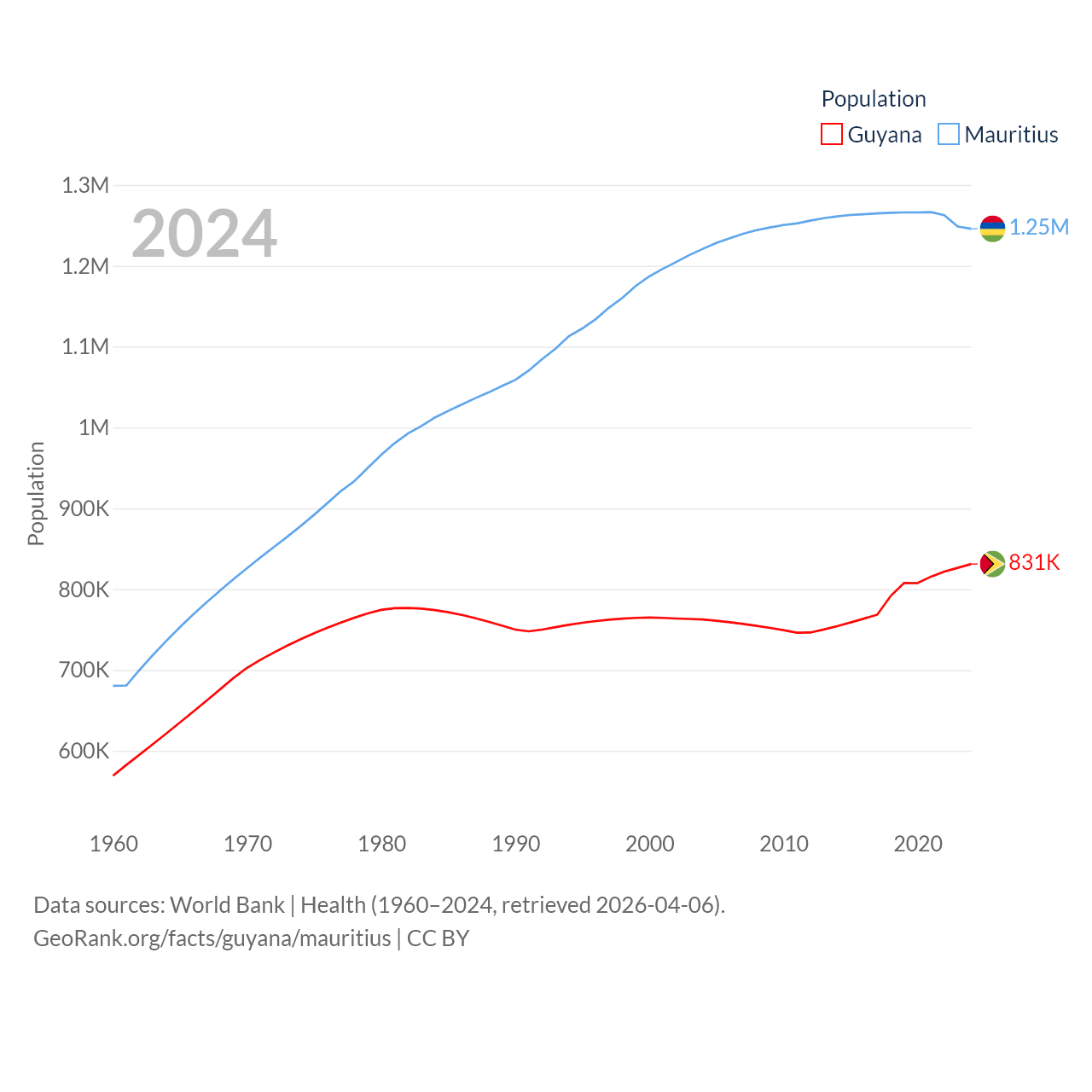 Guyana has a population of 831K (ranked 161/197), compared with 1.25M in Mauritius (ranked 156/197). Guyana's land area is 81,522 sq mi versus 771 sq mi for Mauritius (ranked 82nd vs. 170th).