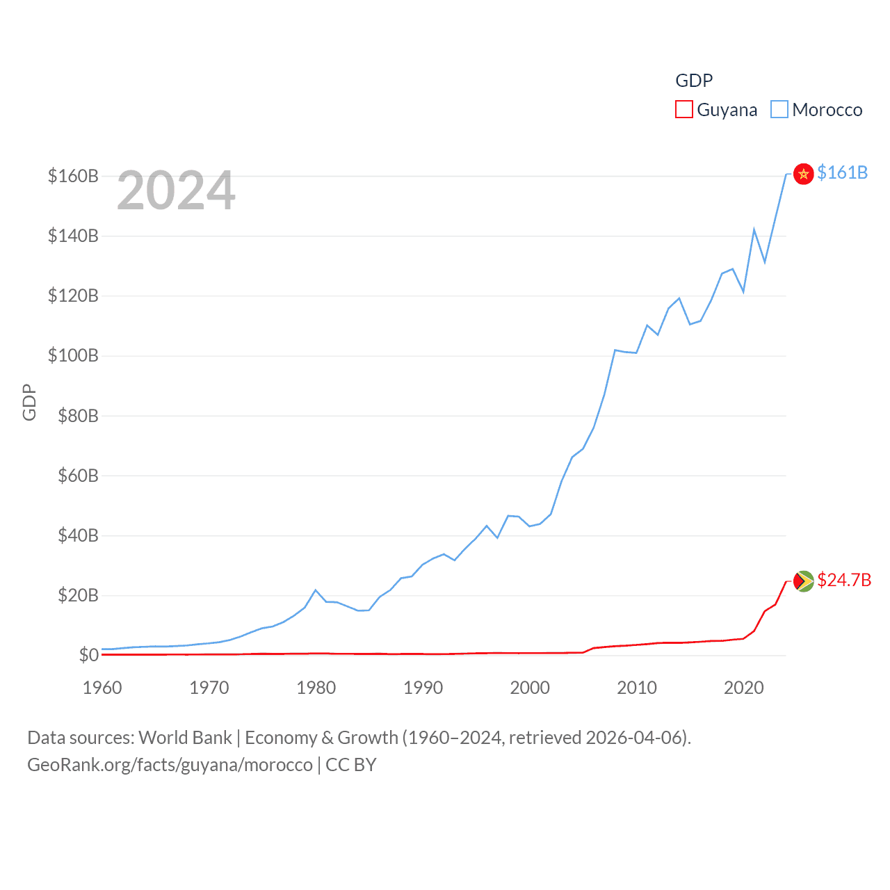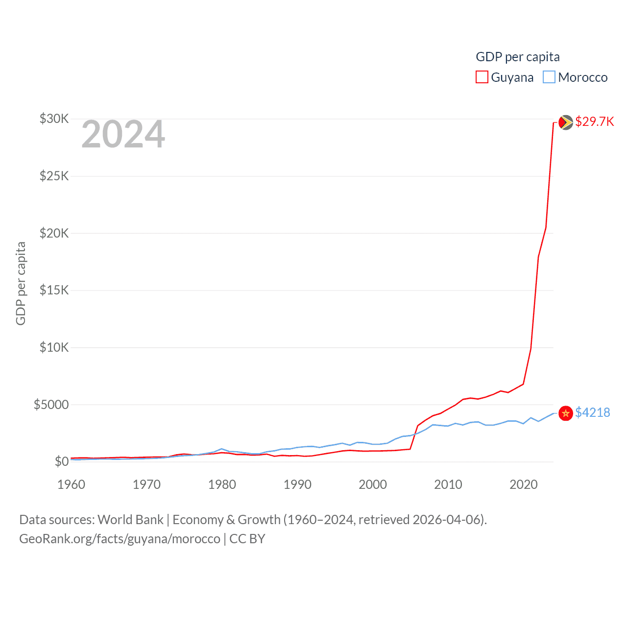 By GDP, Guyana ranks 120/197 ($24.7B) and Morocco ranks 58/197 ($161B). By GDP per capita, Guyana ranks 41/197 ($29,675), while Morocco ranks 127/197 ($4,218).