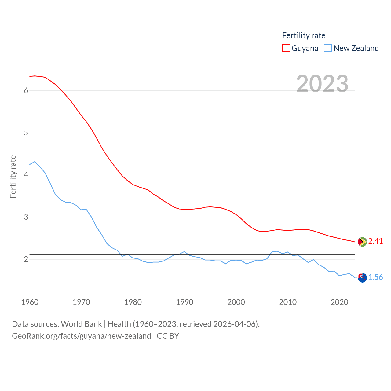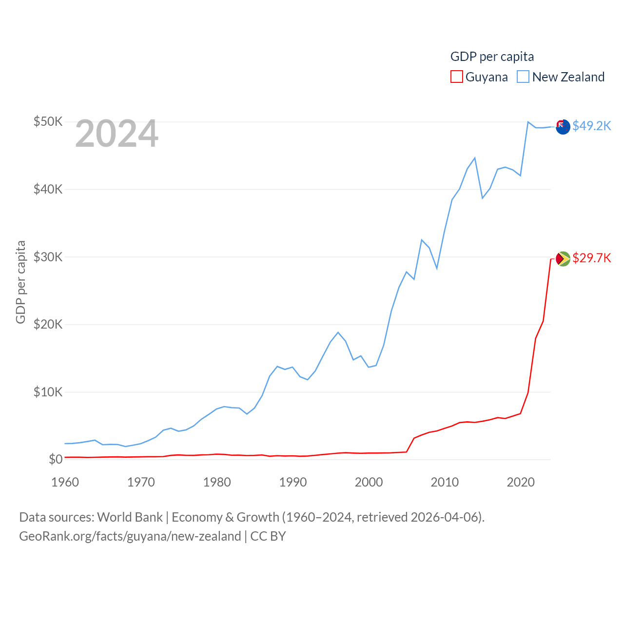By GDP, Guyana ranks 120/197 ($24.7B) and New Zealand ranks 52/197 ($260B). By GDP per capita, Guyana ranks 41/197 ($29,675), while New Zealand ranks 26/197 ($49,205).