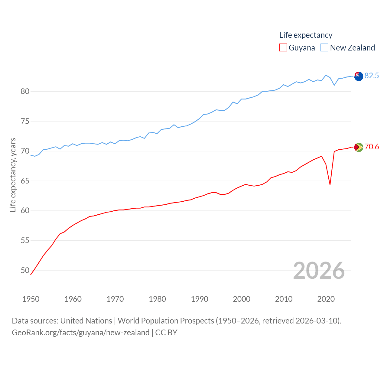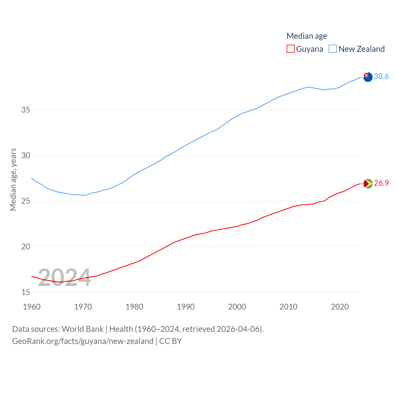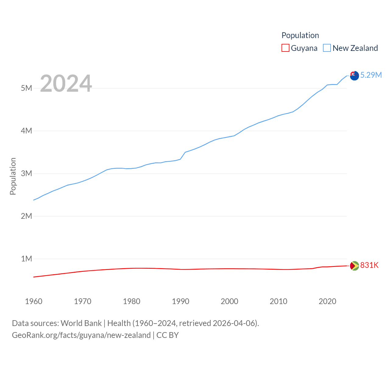 Guyana has a population of 831K (ranked 161/197), compared with 5.29M in New Zealand (ranked 123/197). Guyana's land area is 81,522 sq mi versus 101,665 sq mi for New Zealand (ranked 82nd vs. 74th).