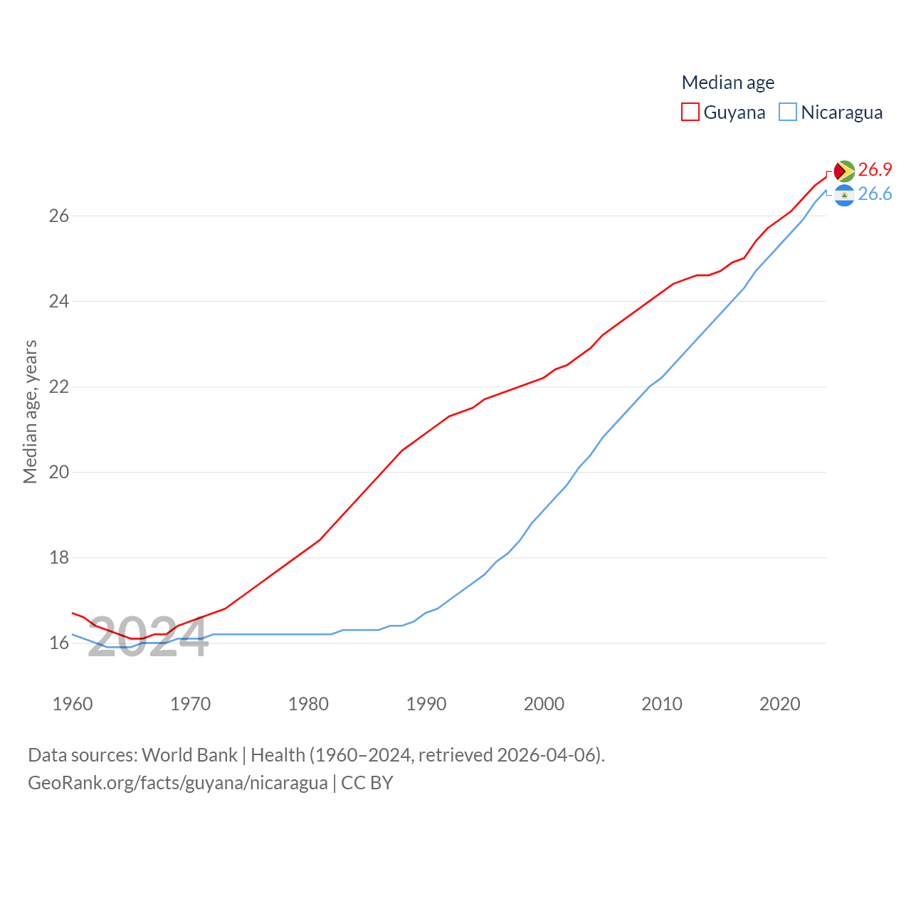 Guyana has a population of 831K (ranked 161/197), compared with 6.92M in Nicaragua (ranked 108/197). Guyana's land area is 81,522 sq mi versus 46,464 sq mi for Nicaragua (ranked 82nd vs. 98th).