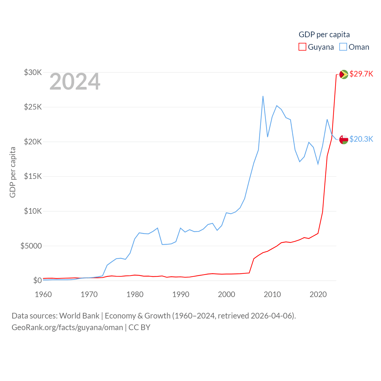 By GDP, Guyana ranks 120/197 ($24.7B) and Oman ranks 70/197 ($107B). By GDP per capita, Guyana ranks 41/197 ($29,675), while Oman ranks 57/197 ($20,285).