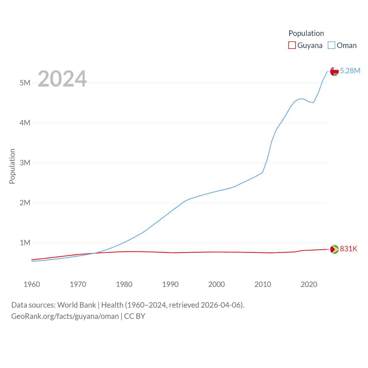 Guyana has a population of 831K (ranked 161/197), compared with 5.28M in Oman (ranked 124/197). Guyana's land area is 81,522 sq mi versus 119,499 sq mi for Oman (ranked 82nd vs. 68th).