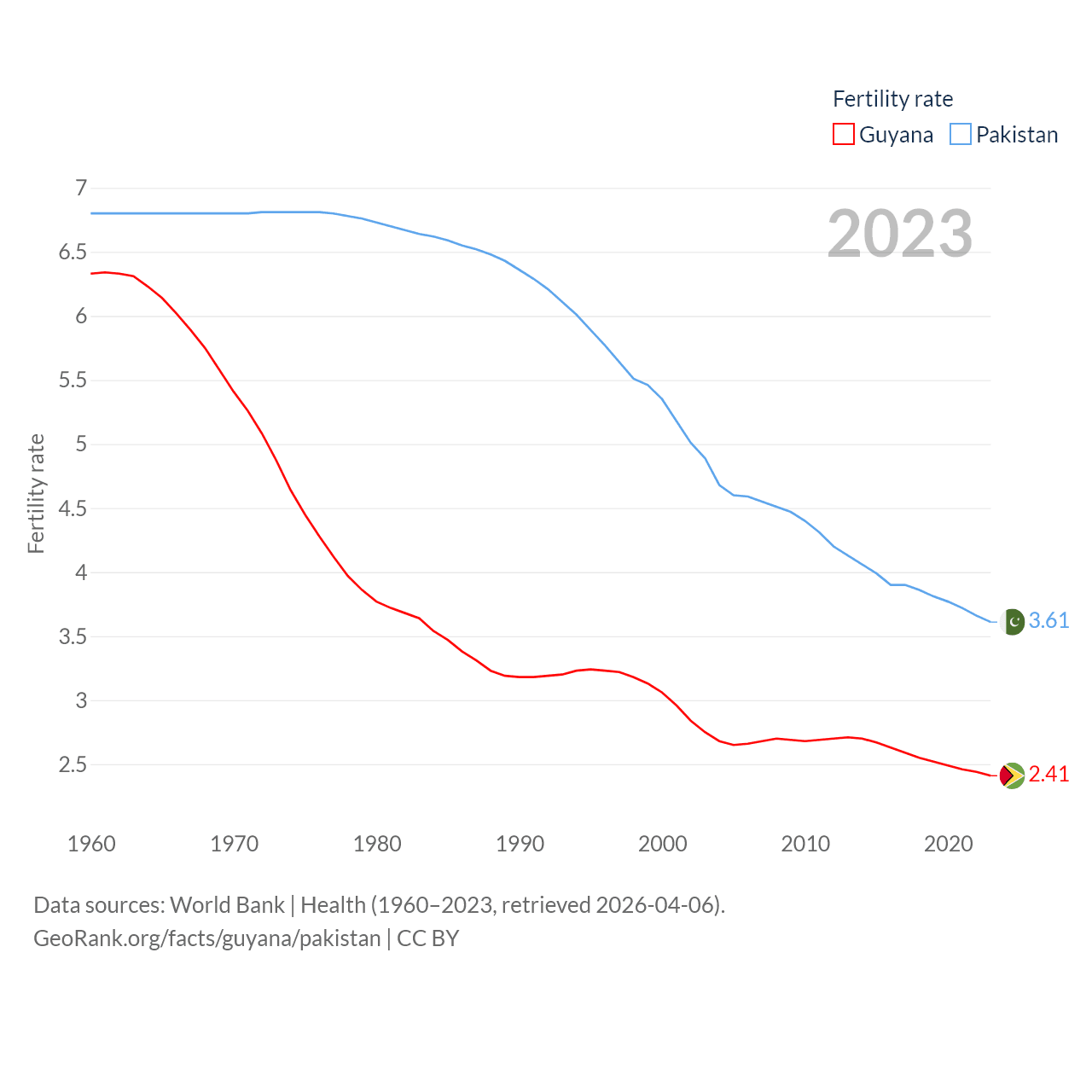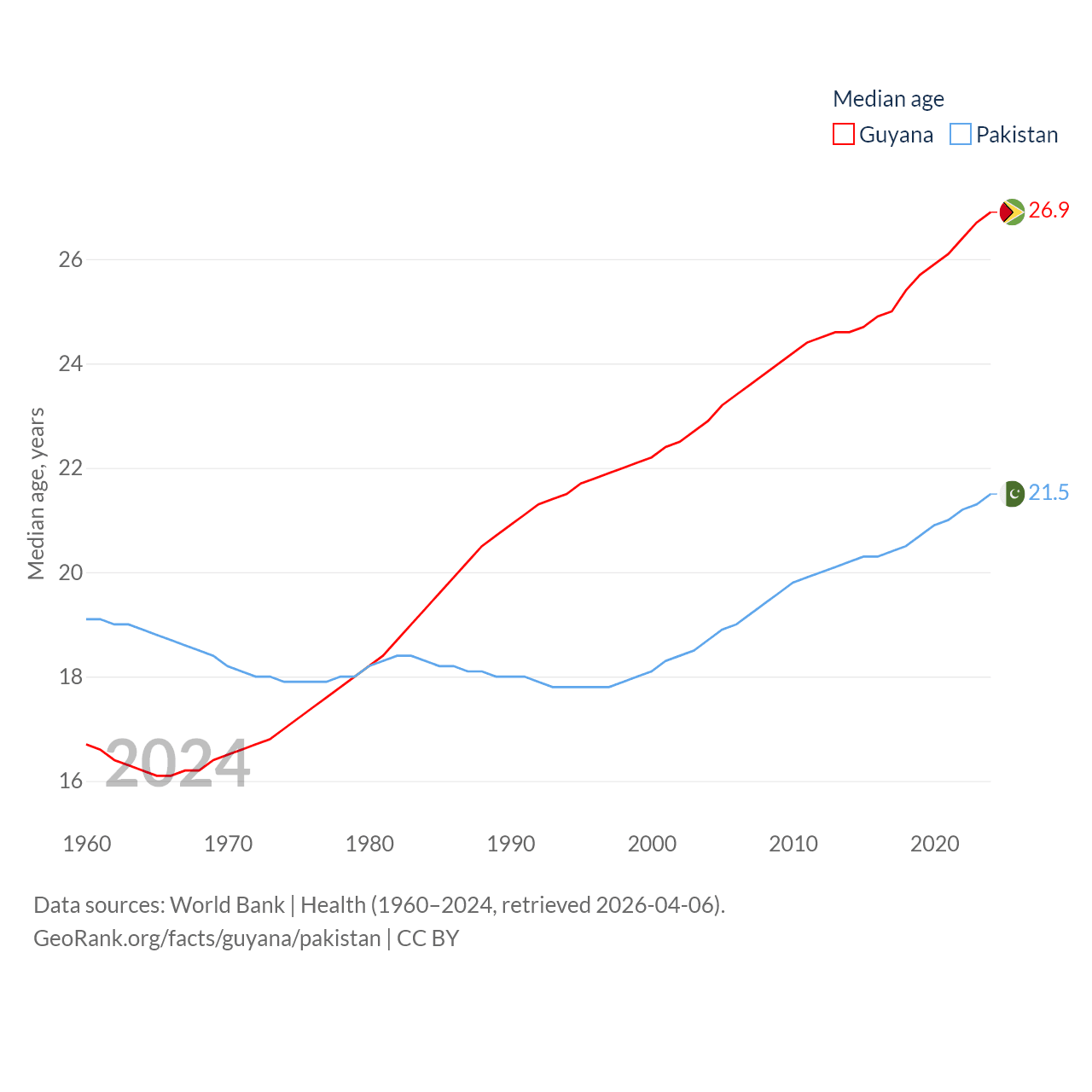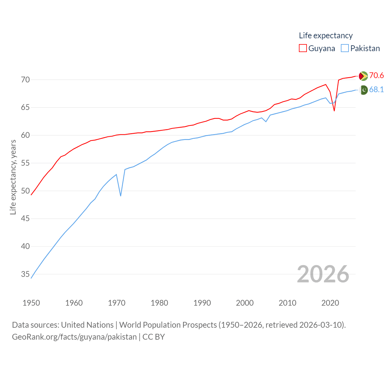Guyana has a population of 831K (ranked 161/197), compared with 251M in Pakistan (ranked 5/197). Guyana's land area is 81,522 sq mi versus 297,638 sq mi for Pakistan (ranked 82nd vs. 35th).