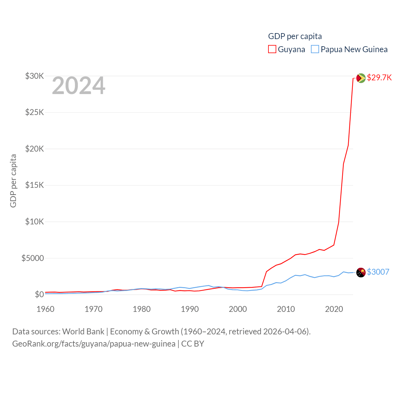 By GDP, Guyana ranks 120/197 ($24.7B) and Papua New Guinea ranks 110/197 ($31.8B). By GDP per capita, Guyana ranks 41/197 ($29,675), while Papua New Guinea ranks 140/197 ($3,007).