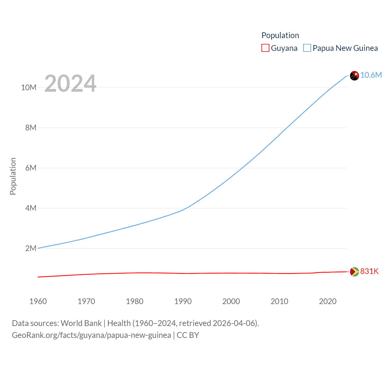 Guyana has a population of 831K (ranked 161/197), compared with 10.6M in Papua New Guinea (ranked 92/197). Guyana's land area is 81,522 sq mi versus 174,850 sq mi for Papua New Guinea (ranked 82nd vs. 54th).
