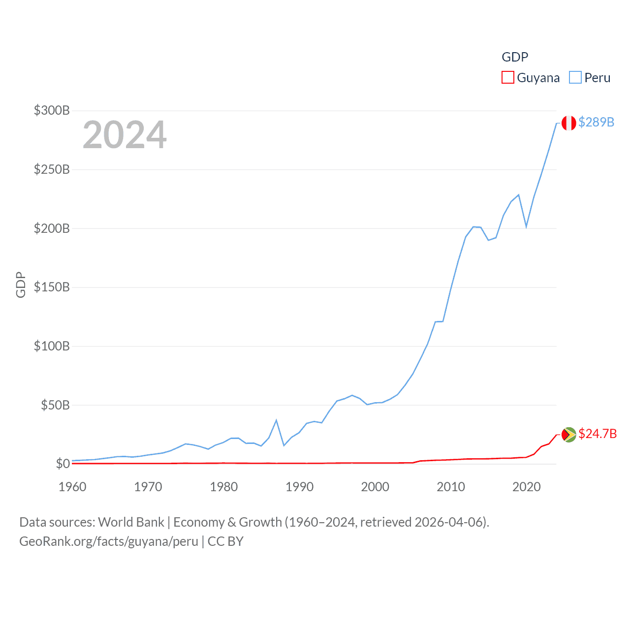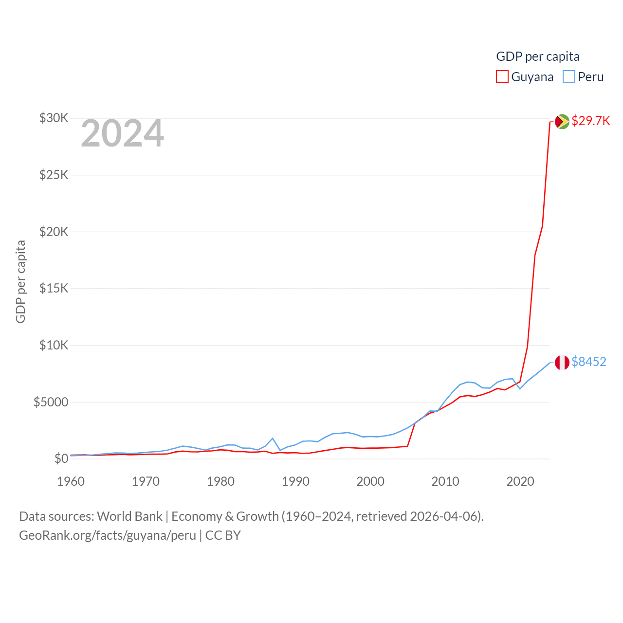 By GDP, Guyana ranks 120/197 ($24.7B) and Peru ranks 49/197 ($289B). By GDP per capita, Guyana ranks 41/197 ($29,675), while Peru ranks 91/197 ($8,452).