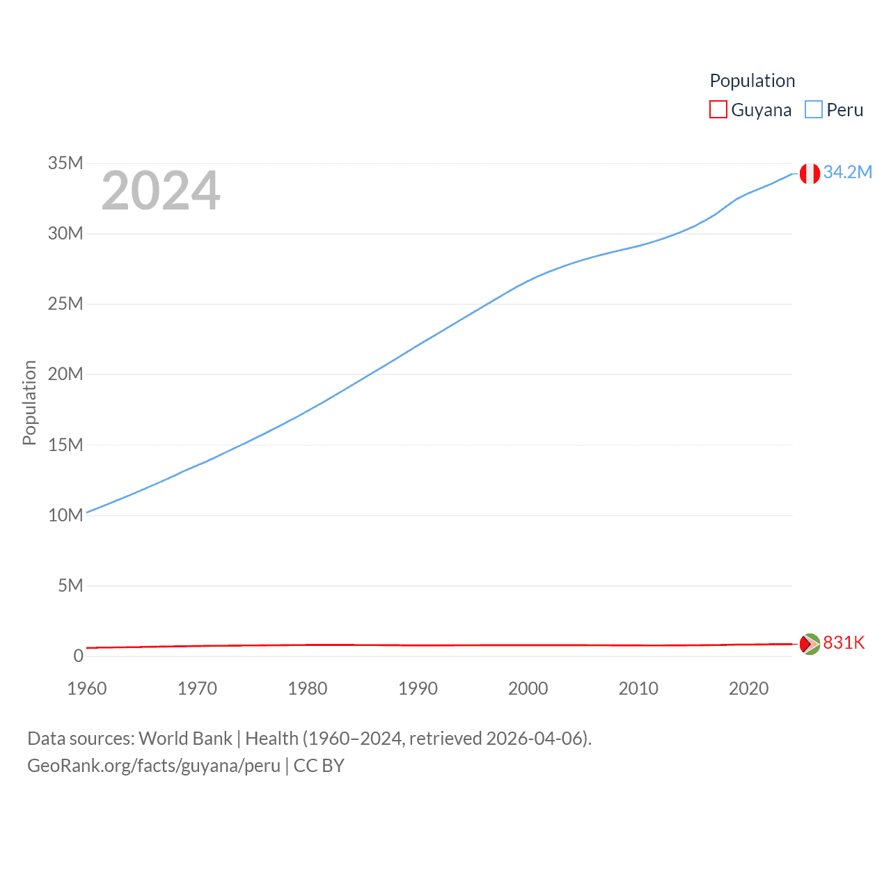Guyana has a population of 831K (ranked 161/197), compared with 34.2M in Peru (ranked 48/197). Guyana's land area is 81,522 sq mi versus 494,211 sq mi for Peru (ranked 82nd vs. 19th).