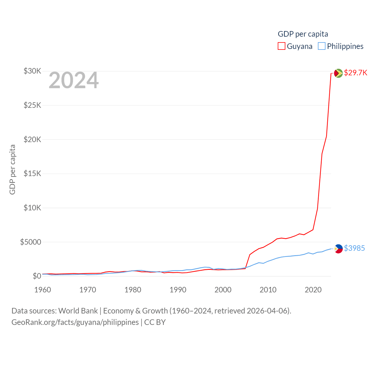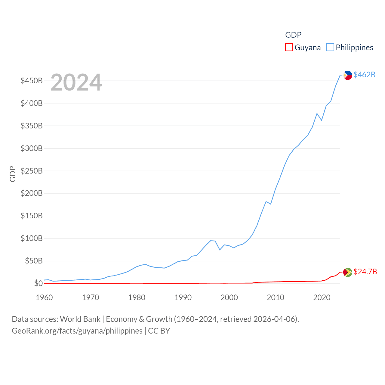 By GDP, Guyana ranks 120/197 ($24.7B) and The Philippines ranks 35/197 ($462B). By GDP per capita, Guyana ranks 41/197 ($29,675), while The Philippines ranks 130/197 ($3,985).