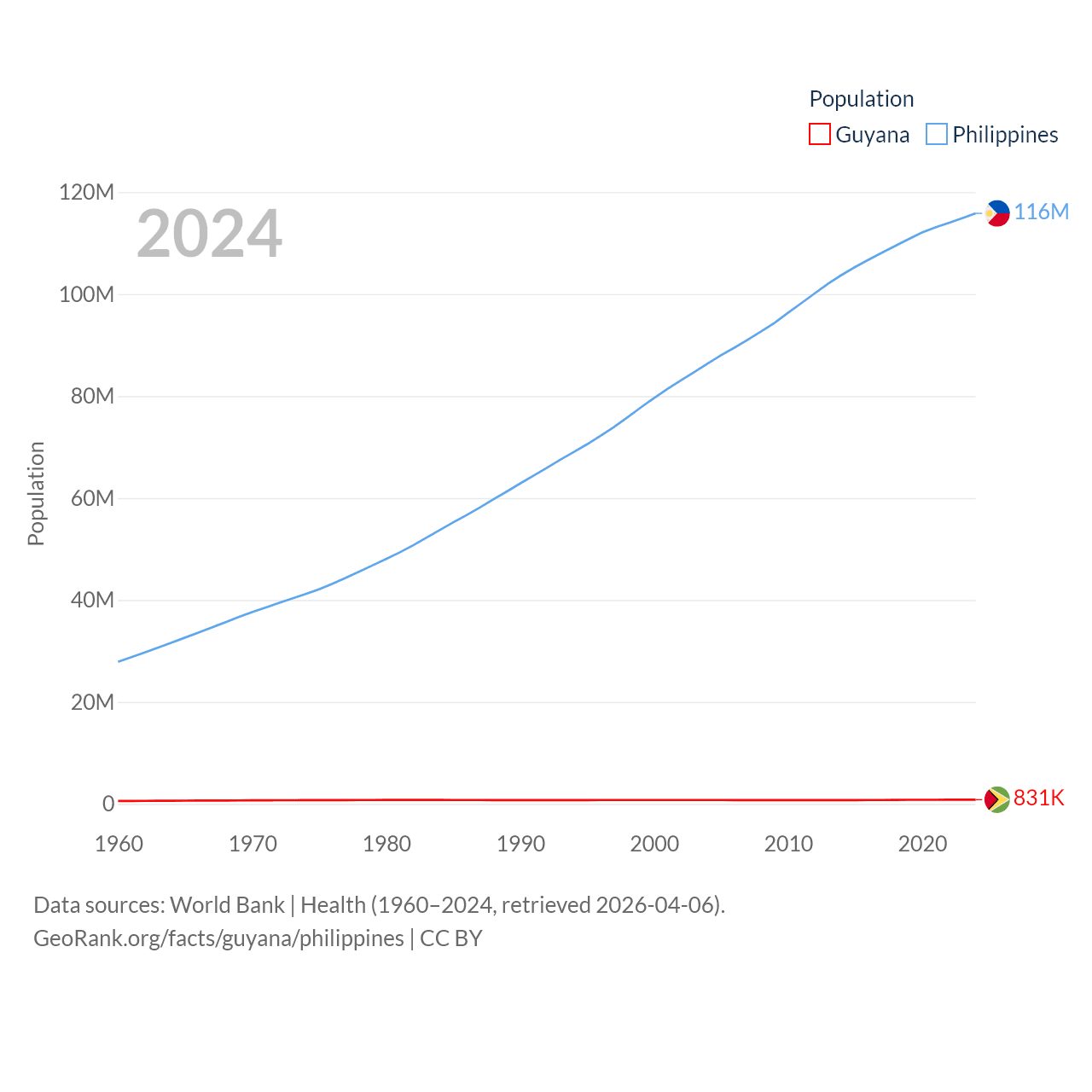 Guyana has a population of 831K (ranked 161/197), compared with 116M in The Philippines (ranked 14/197). Guyana's land area is 81,522 sq mi versus 115,124 sq mi for The Philippines (ranked 82nd vs. 71st).