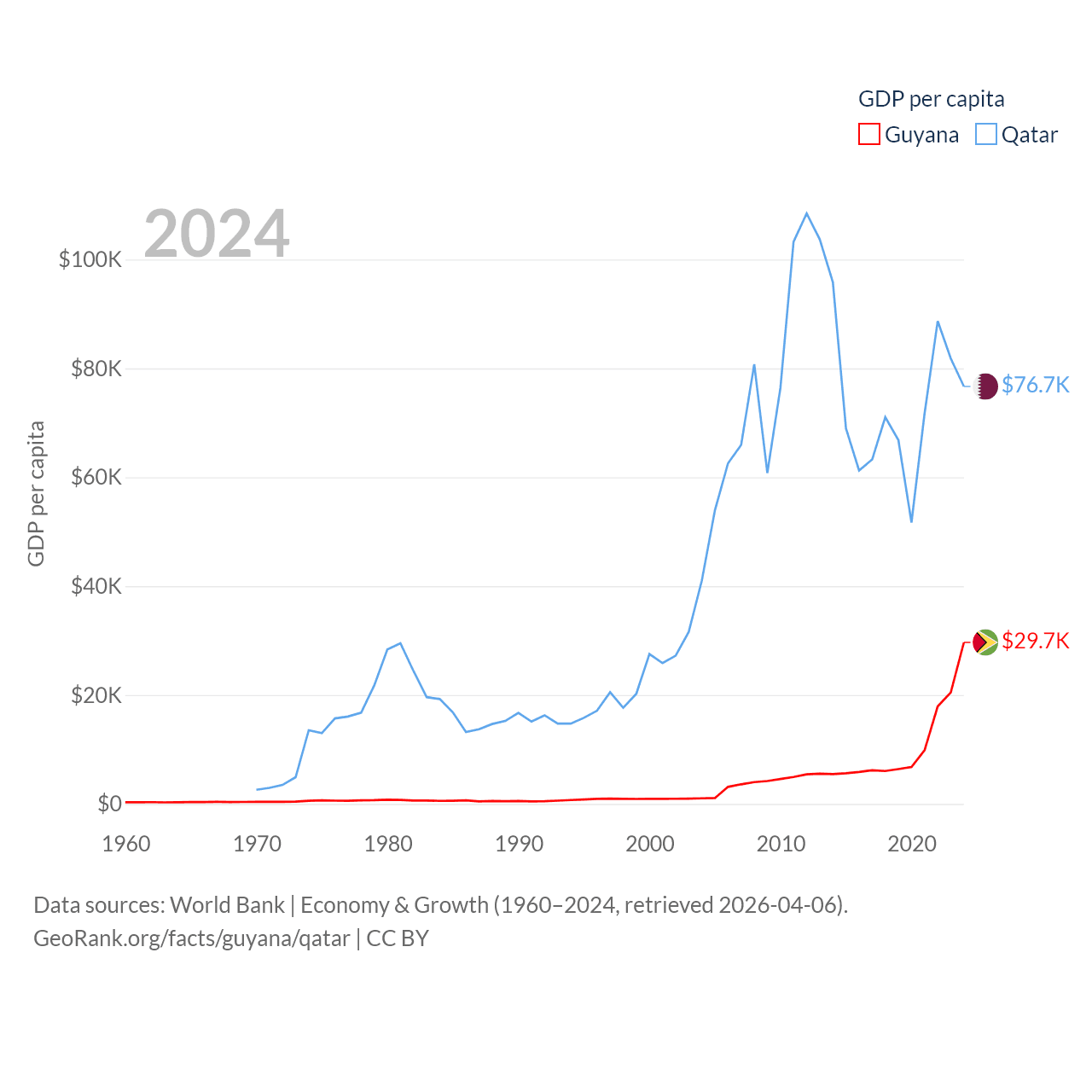 By GDP, Guyana ranks 120/197 ($24.7B) and Qatar ranks 56/197 ($219B). By GDP per capita, Guyana ranks 41/197 ($29,675), while Qatar ranks 11/197 ($76,689).