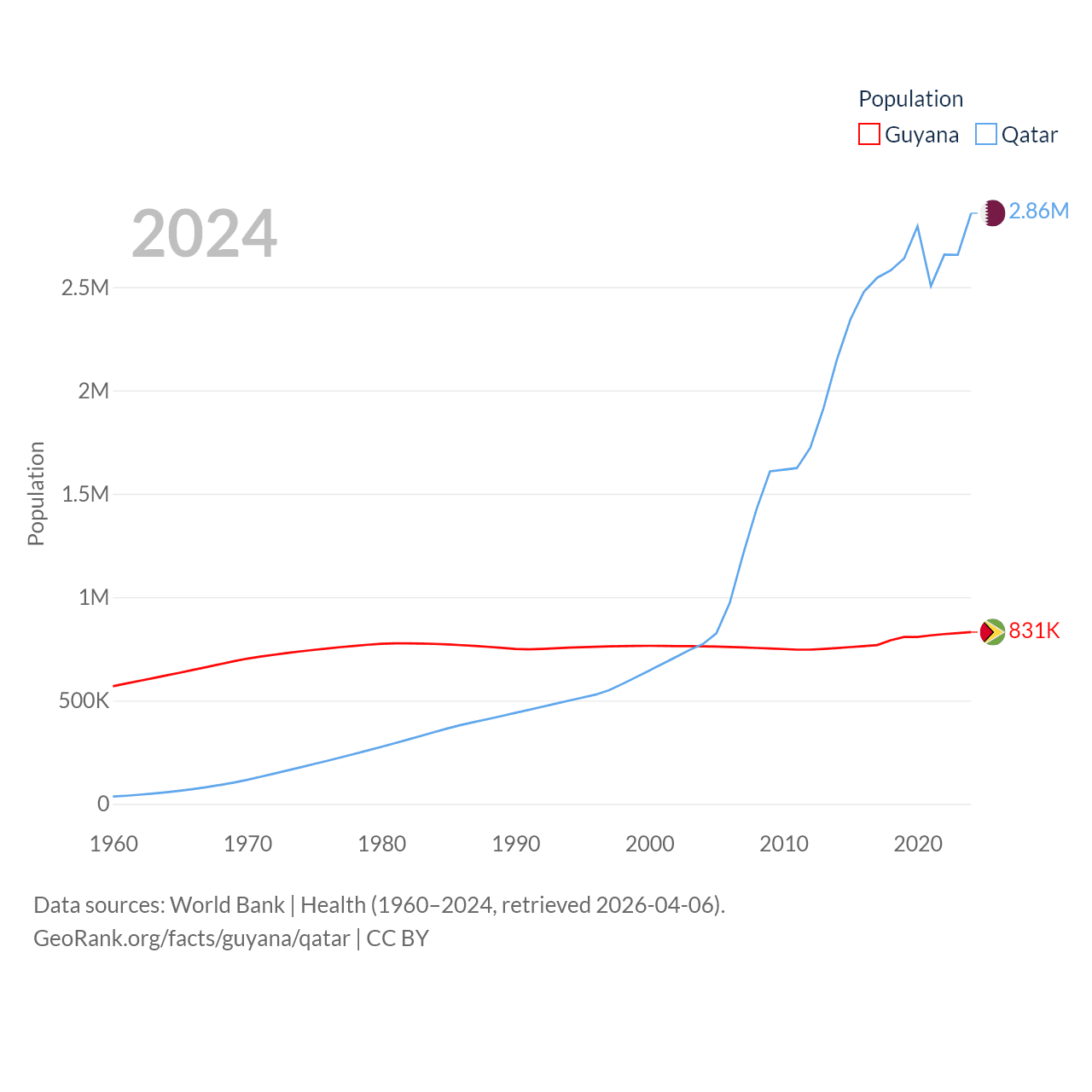 Guyana has a population of 831K (ranked 161/197), compared with 2.86M in Qatar (ranked 138/197). Guyana's land area is 81,522 sq mi versus 4,436 sq mi for Qatar (ranked 82nd vs. 158th).