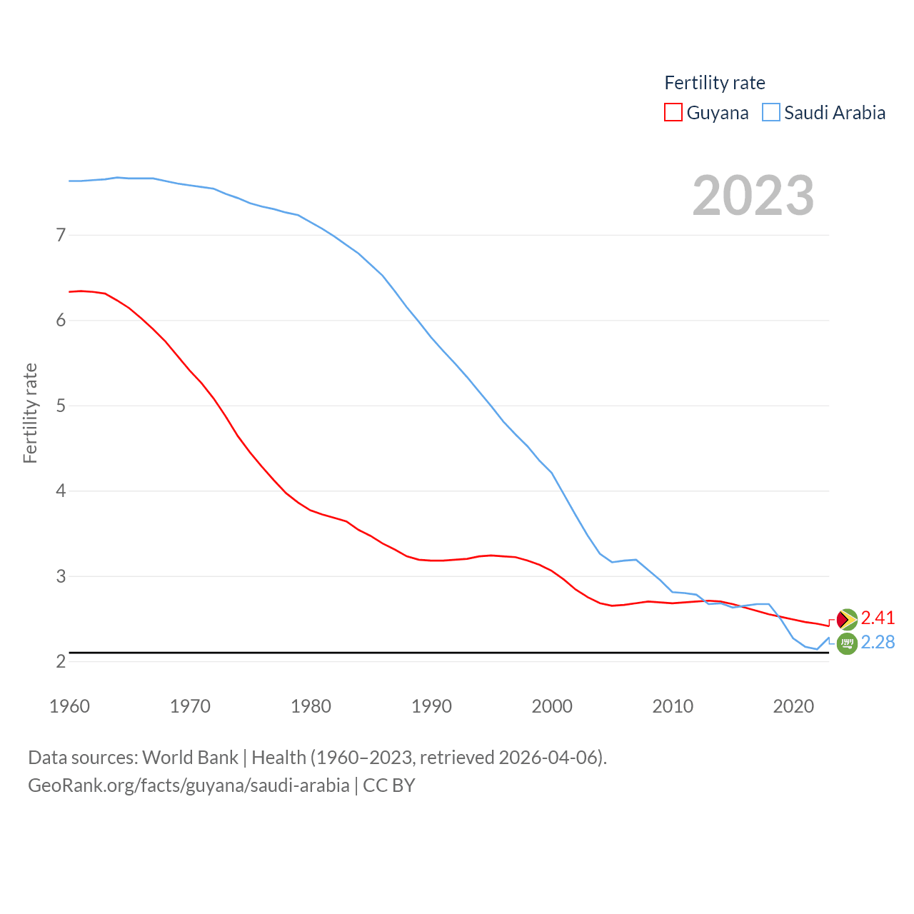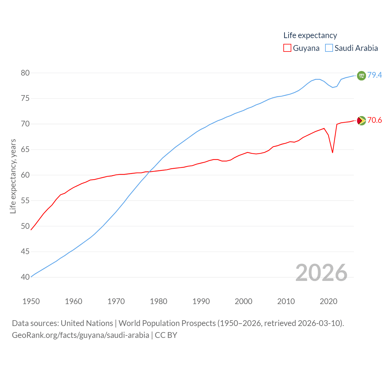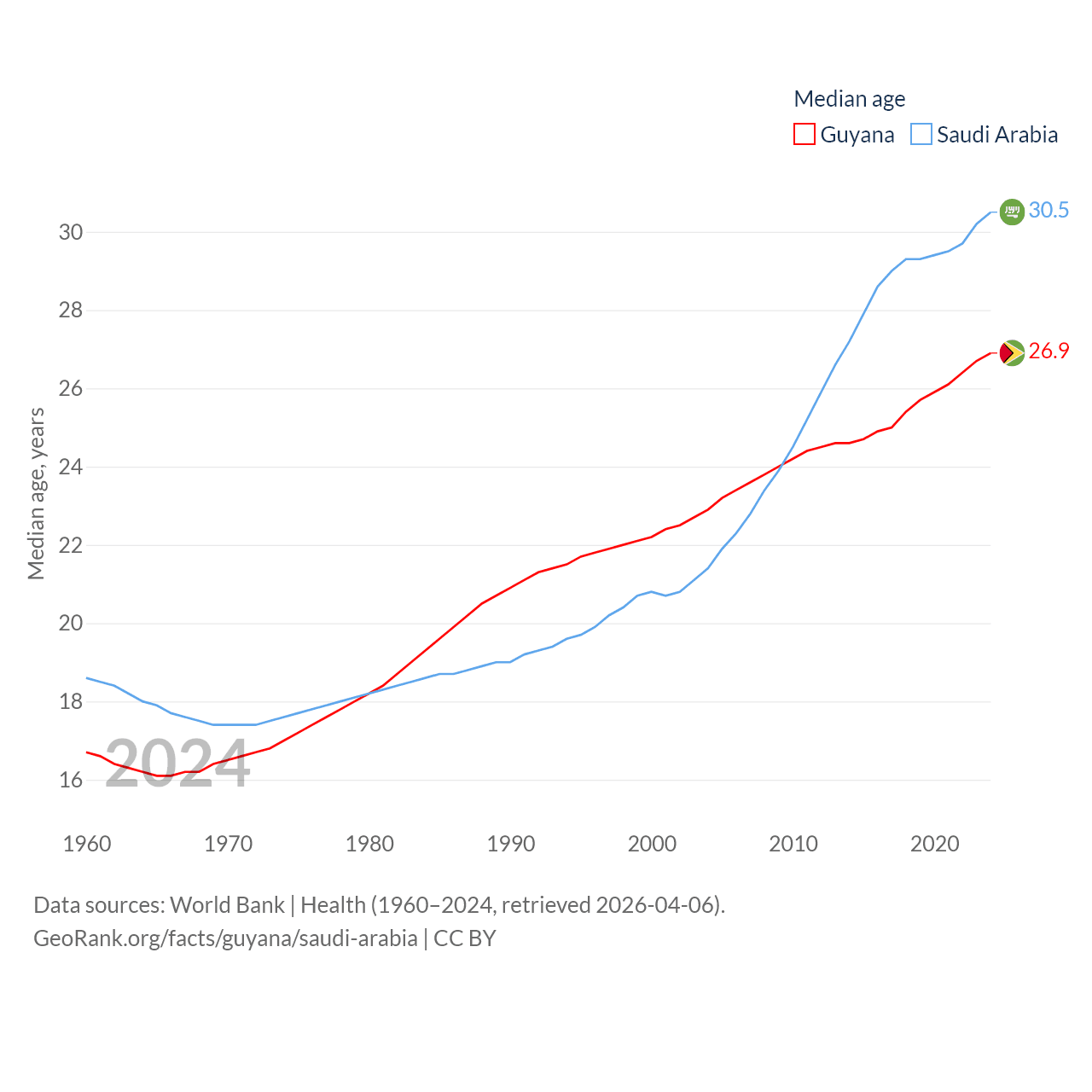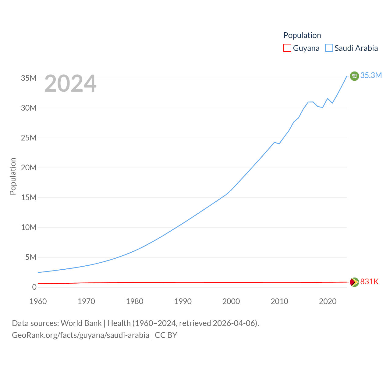 Guyana has a population of 831K (ranked 161/197), compared with 35.3M in Saudi Arabia (ranked 45/197). Guyana's land area is 81,522 sq mi versus 830,000 sq mi for Saudi Arabia (ranked 82nd vs. 12th).