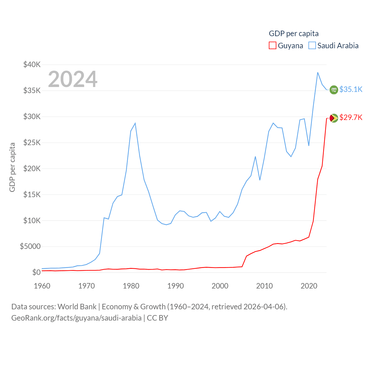 By GDP, Guyana ranks 120/197 ($24.7B) and Saudi Arabia ranks 18/197 ($1.24T). By GDP per capita, Guyana ranks 41/197 ($29,675), while Saudi Arabia ranks 33/197 ($35,122).