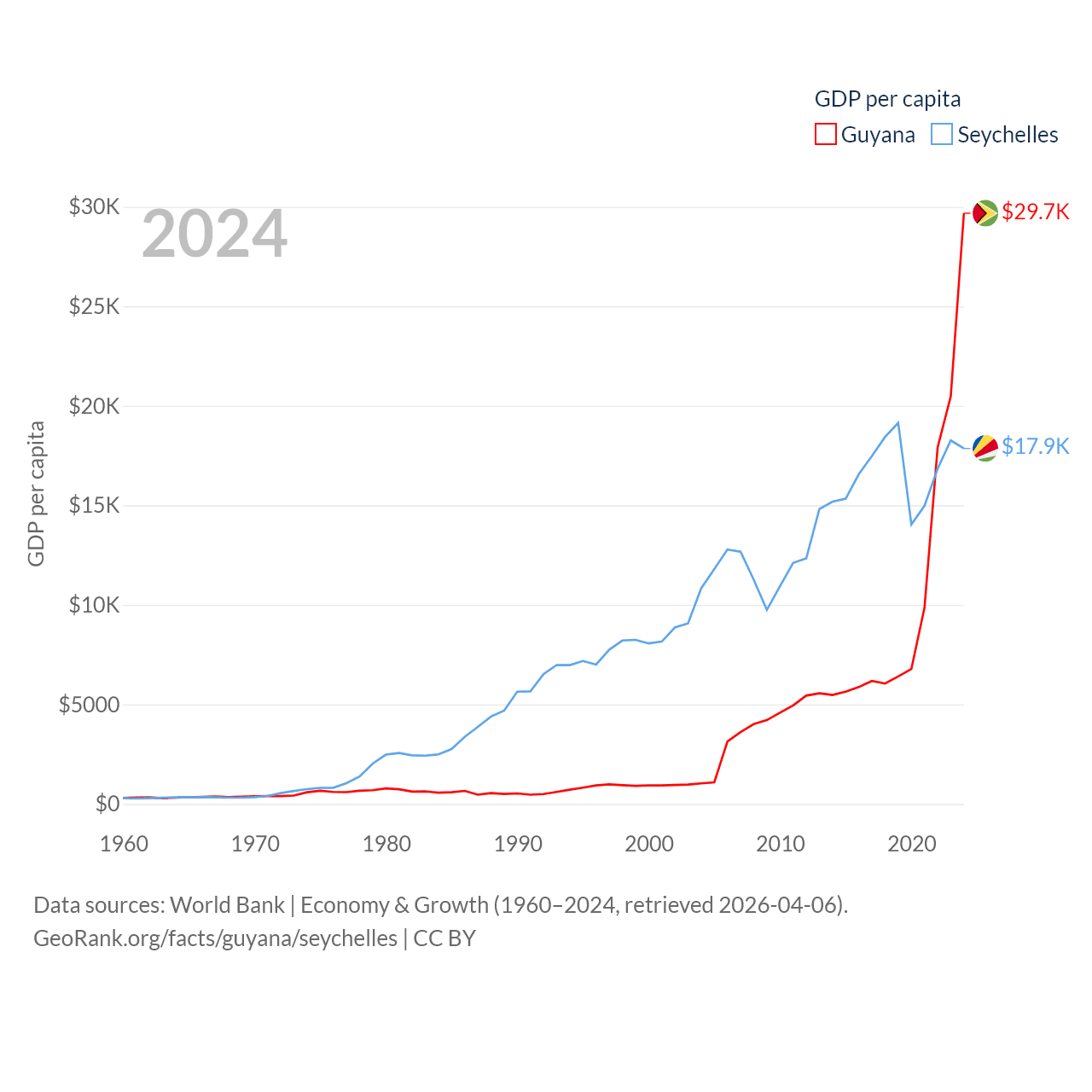 By GDP, Guyana ranks 120/197 ($24.7B) and The Seychelles ranks 178/197 ($2.17B). By GDP per capita, Guyana ranks 41/197 ($29,675), while The Seychelles ranks 63/197 ($17,859).