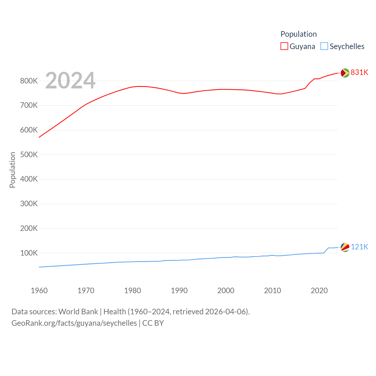 Guyana has a population of 831K (ranked 161/197), compared with 121K in The Seychelles (ranked 181/197). Guyana's land area is 81,522 sq mi versus 177.6 sq mi for The Seychelles (ranked 82nd vs. 181st).