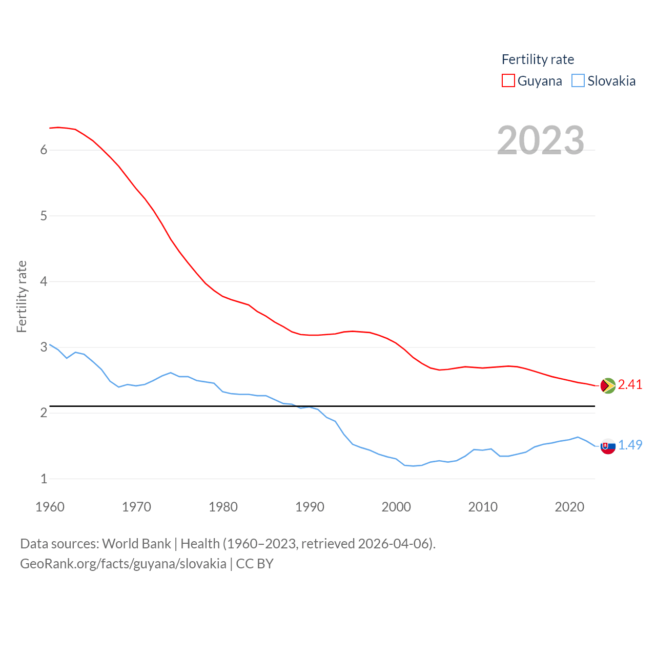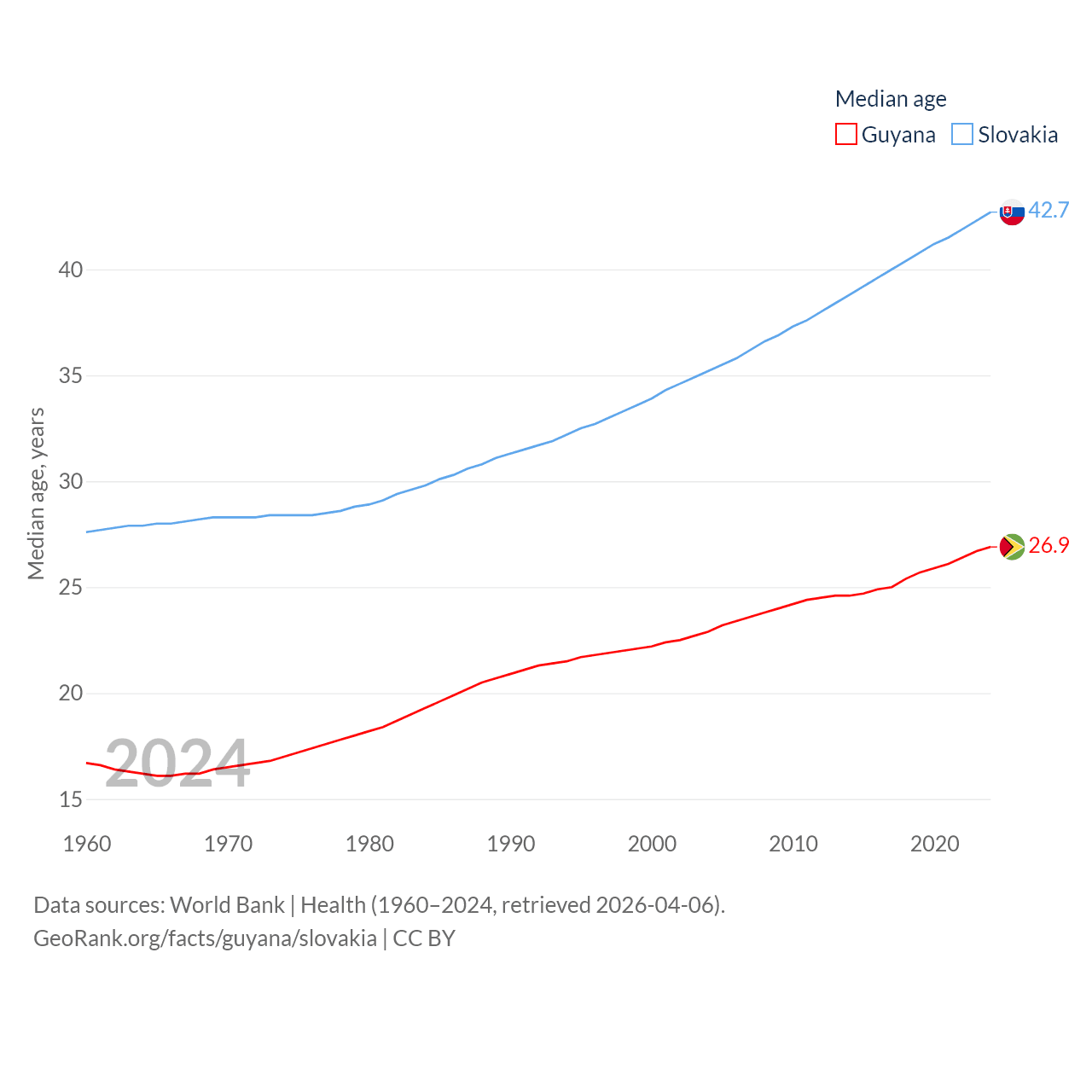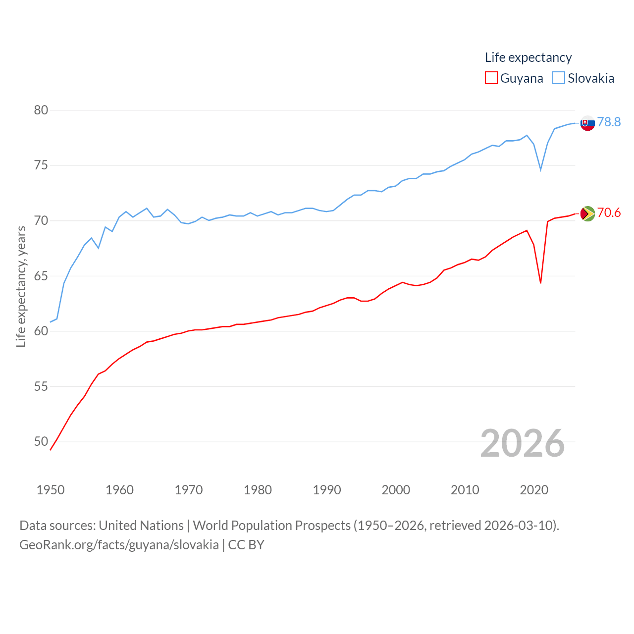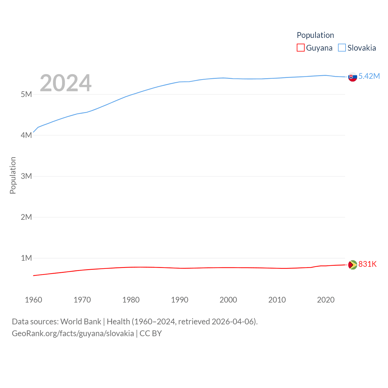 Guyana has a population of 831K (ranked 161/197), compared with 5.42M in Slovakia (ranked 119/197). Guyana's land area is 81,522 sq mi versus 18,564 sq mi for Slovakia (ranked 82nd vs. 128th).