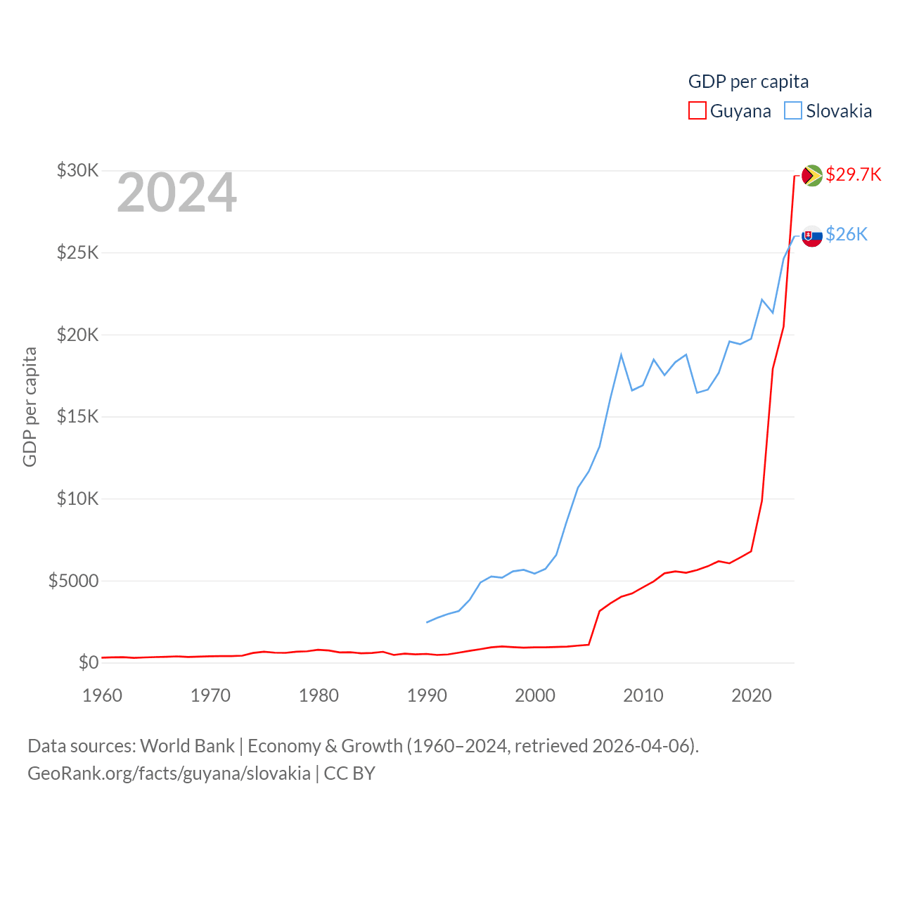 By GDP, Guyana ranks 120/197 ($24.7B) and Slovakia ranks 61/197 ($141B). By GDP per capita, Guyana ranks 41/197 ($29,675), while Slovakia ranks 47/197 ($25,993).