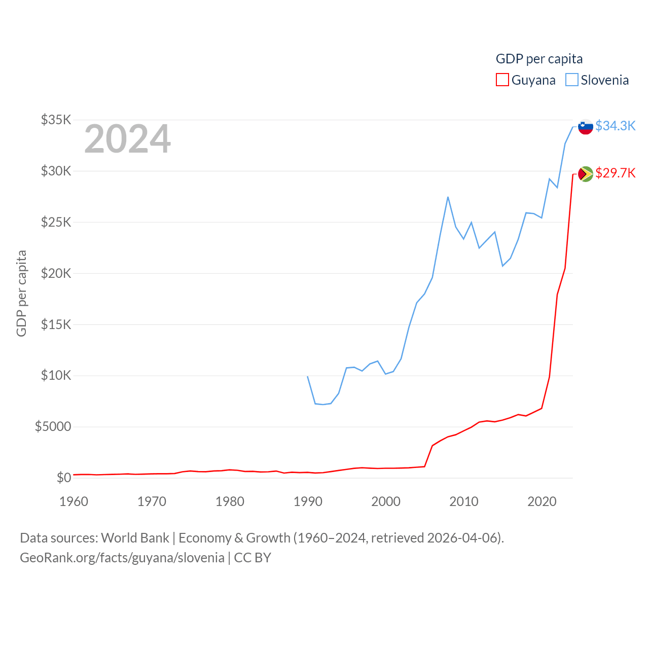 By GDP, Guyana ranks 120/197 ($24.7B) and Slovenia ranks 86/197 ($73B). By GDP per capita, Guyana ranks 41/197 ($29,675), while Slovenia ranks 34/197 ($34,301).