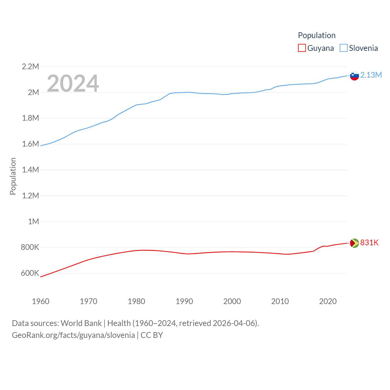 Guyana has a population of 831K (ranked 161/197), compared with 2.13M in Slovenia (ranked 147/197). Guyana's land area is 81,522 sq mi versus 7,774 sq mi for Slovenia (ranked 82nd vs. 151st).