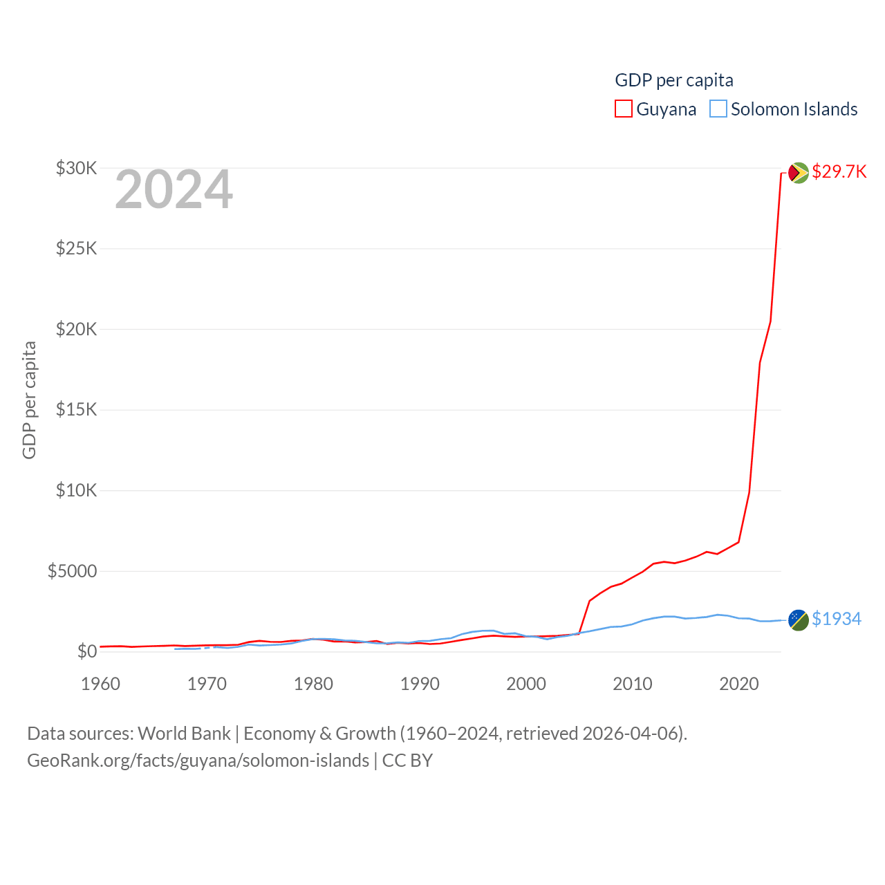 By GDP, Guyana ranks 120/197 ($24.7B) and The Solomon Islands ranks 182/197 ($1.58B). By GDP per capita, Guyana ranks 41/197 ($29,675), while The Solomon Islands ranks 157/197 ($1,934).